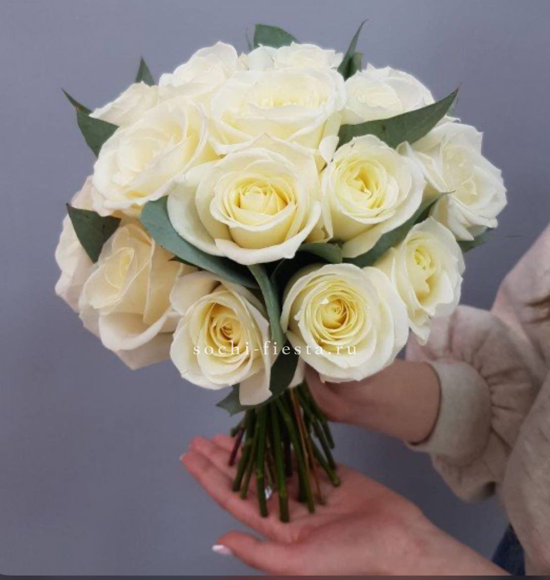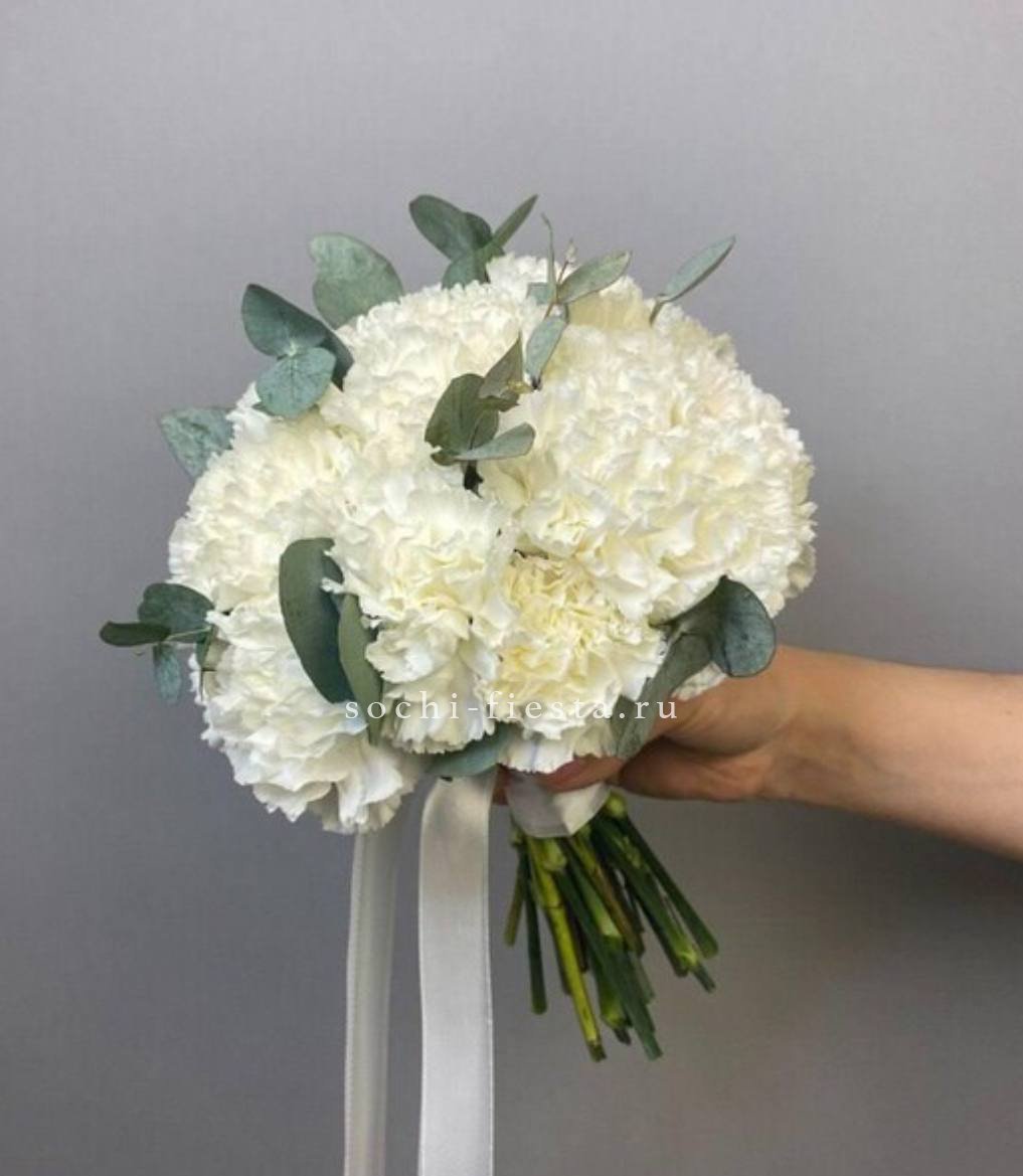 Двадцать один белый диантус собран в плотную округлую форму с серебристыми ветками эвкалипта. Классический свадебный букет с аккуратным силуэтом и атласной лентой на ножке.