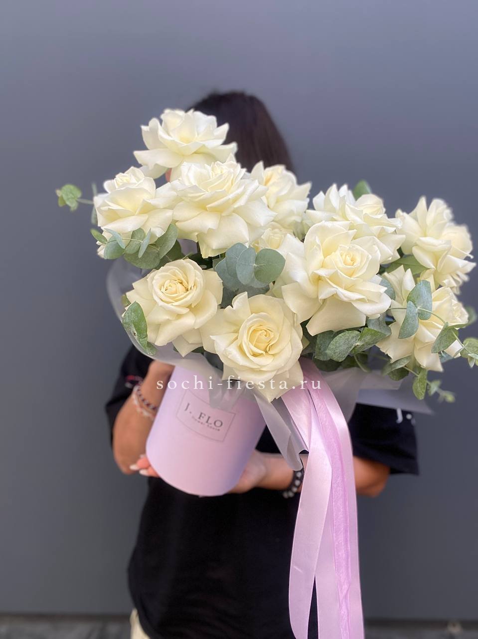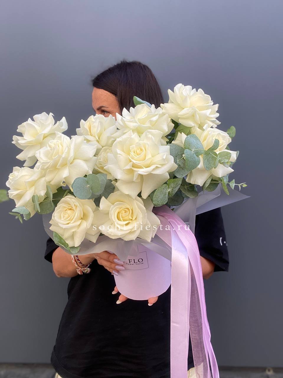 Белые розы собраны в плотную округлую форму с ровным силуэтом. Дизайнерская упаковка подчёркивает графичность линий и создаёт завершённую композицию. Букет с выразительным присутствием.