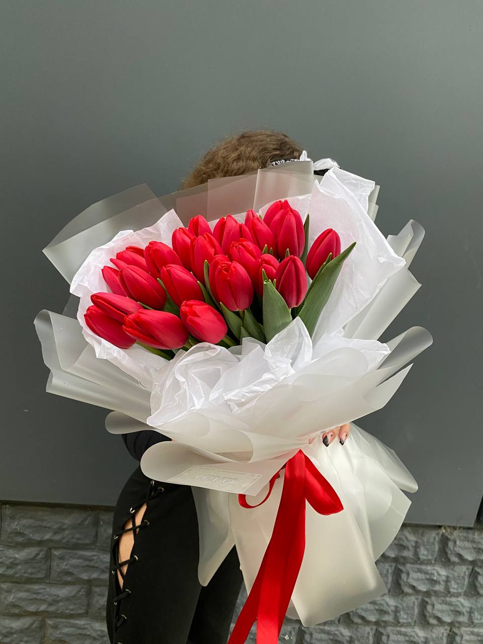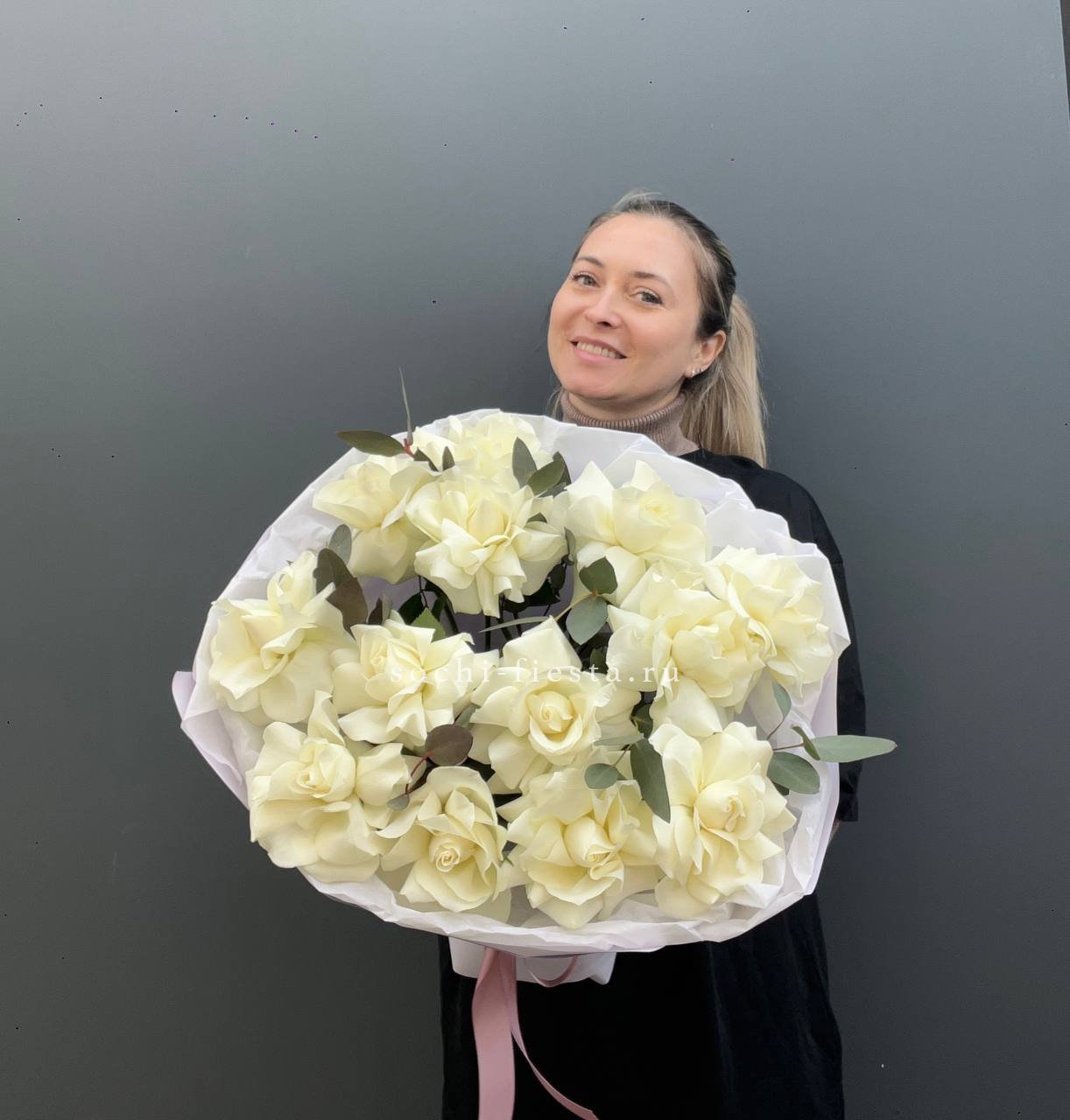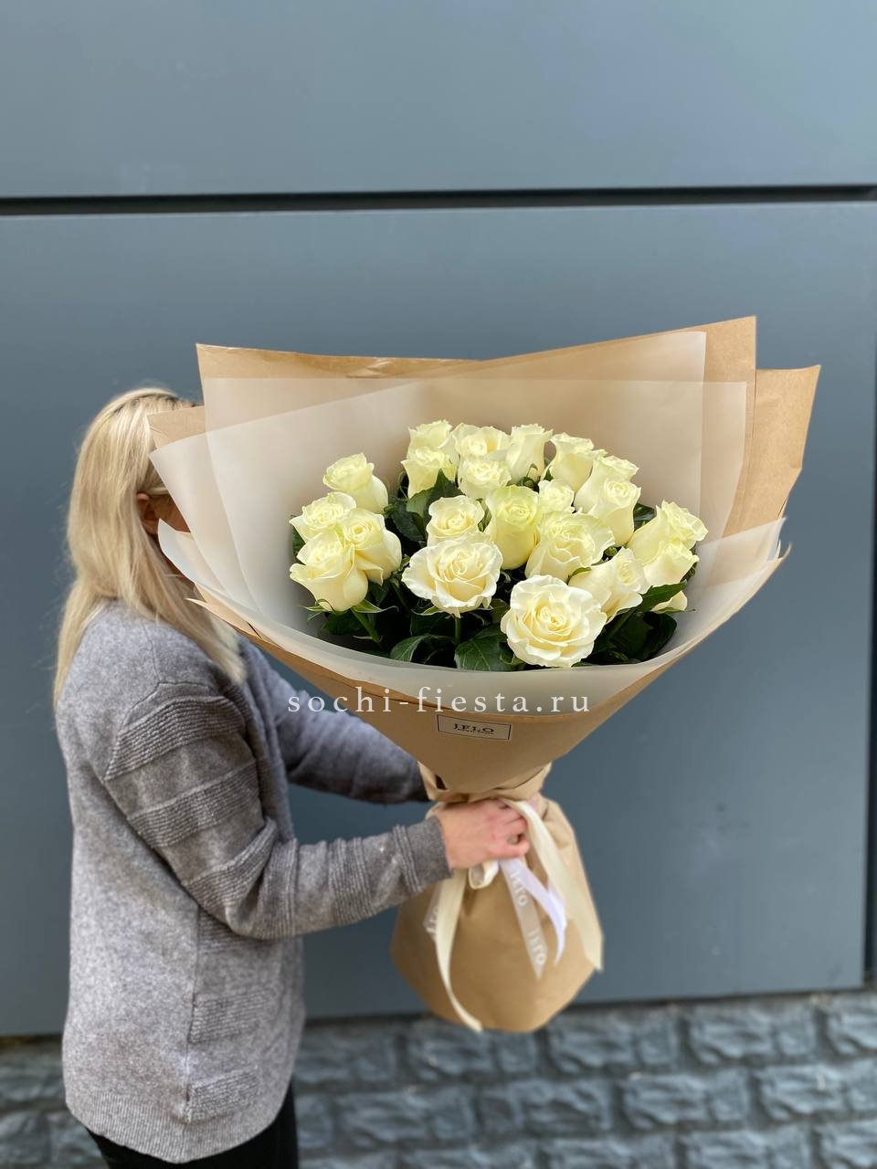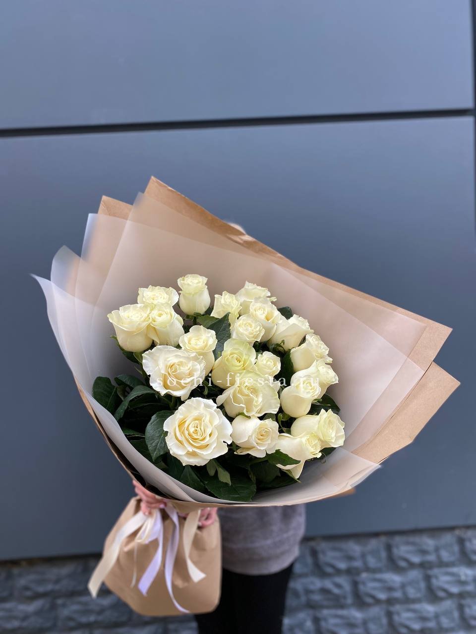 Пятнадцать белых роз в тонкой дизайнерской упаковке создают ощущение лёгкости и чистоты. Матовая текстура бумаги и мягкие складки подчёркивают форму каждого бутона. Композиция выглядит свежо и современно.