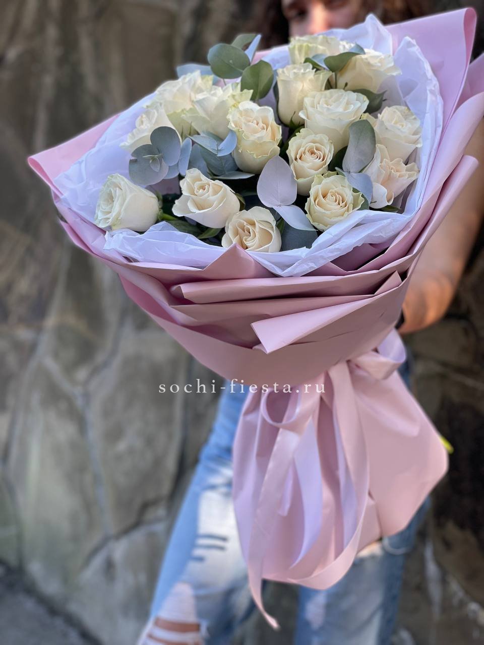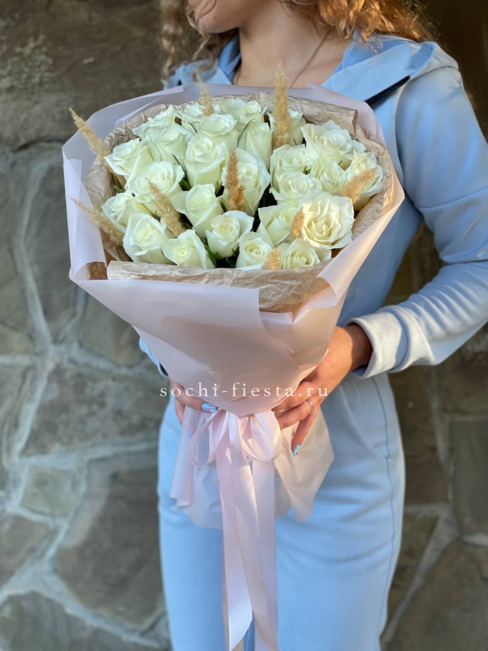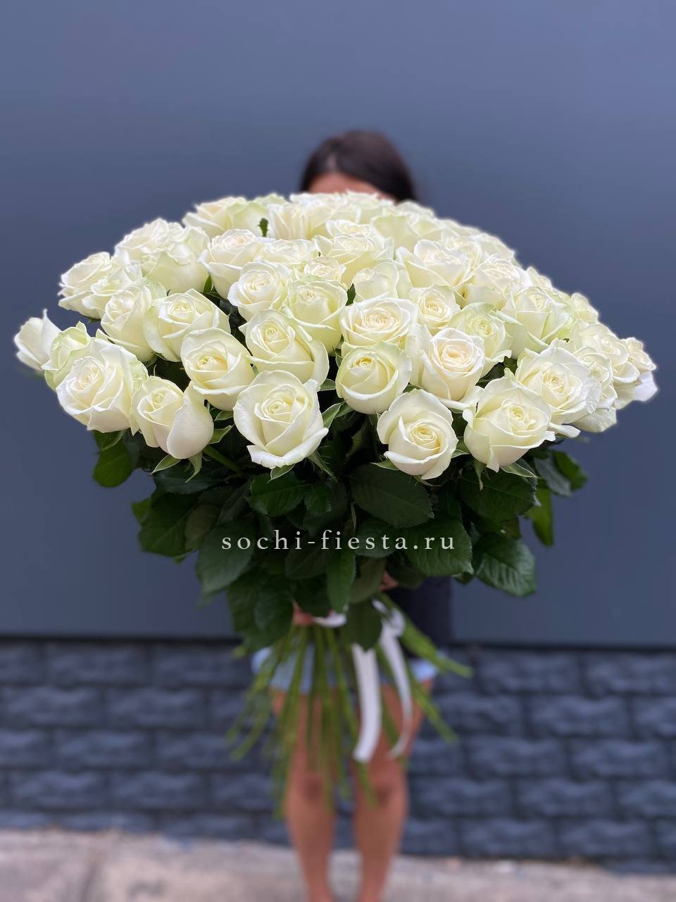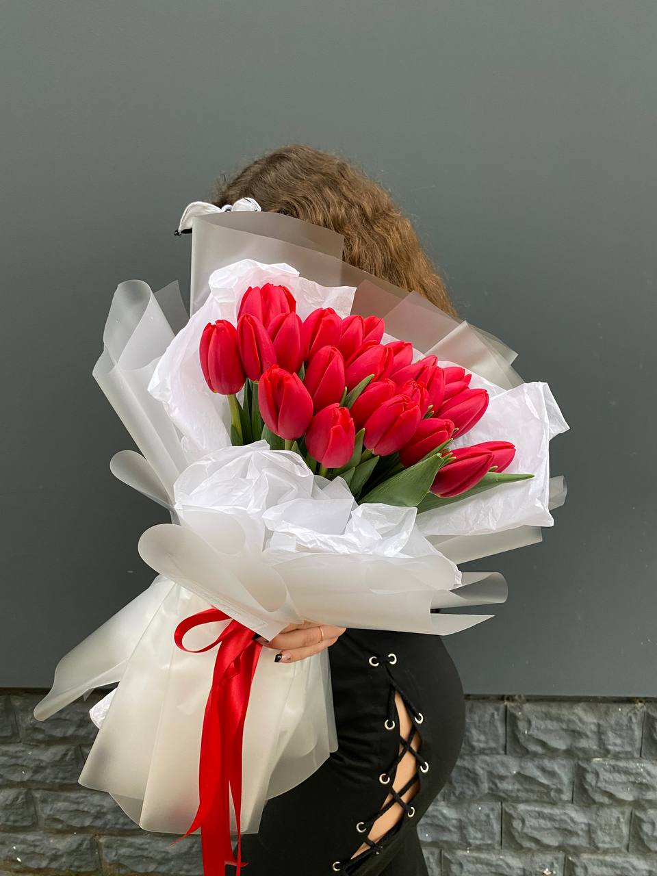Пятнадцать белых роз в тонкой дизайнерской упаковке создают ощущение лёгкости и чистоты. Матовая текстура бумаги и мягкие складки подчёркивают форму каждого бутона. Композиция выглядит свежо и современно.