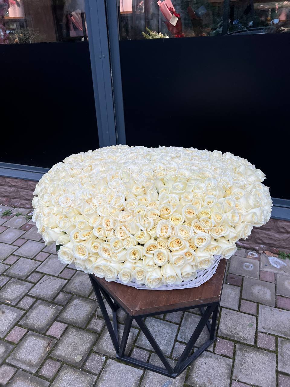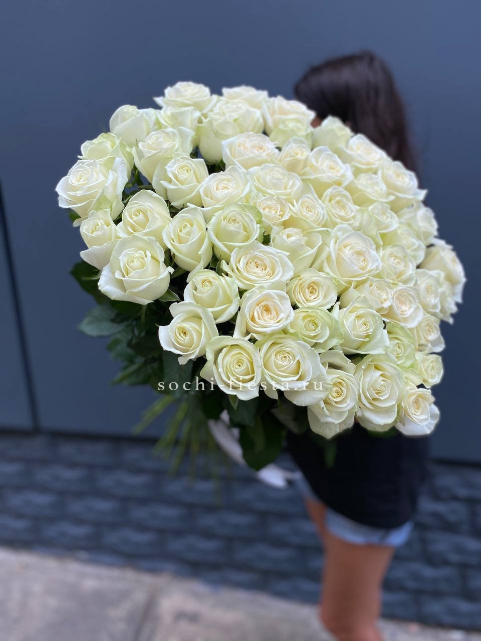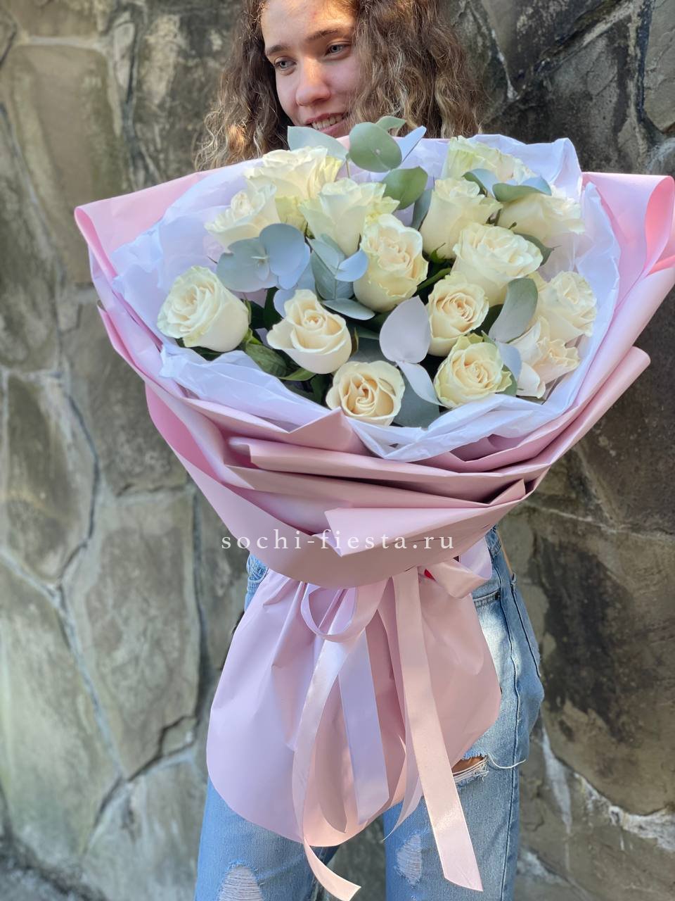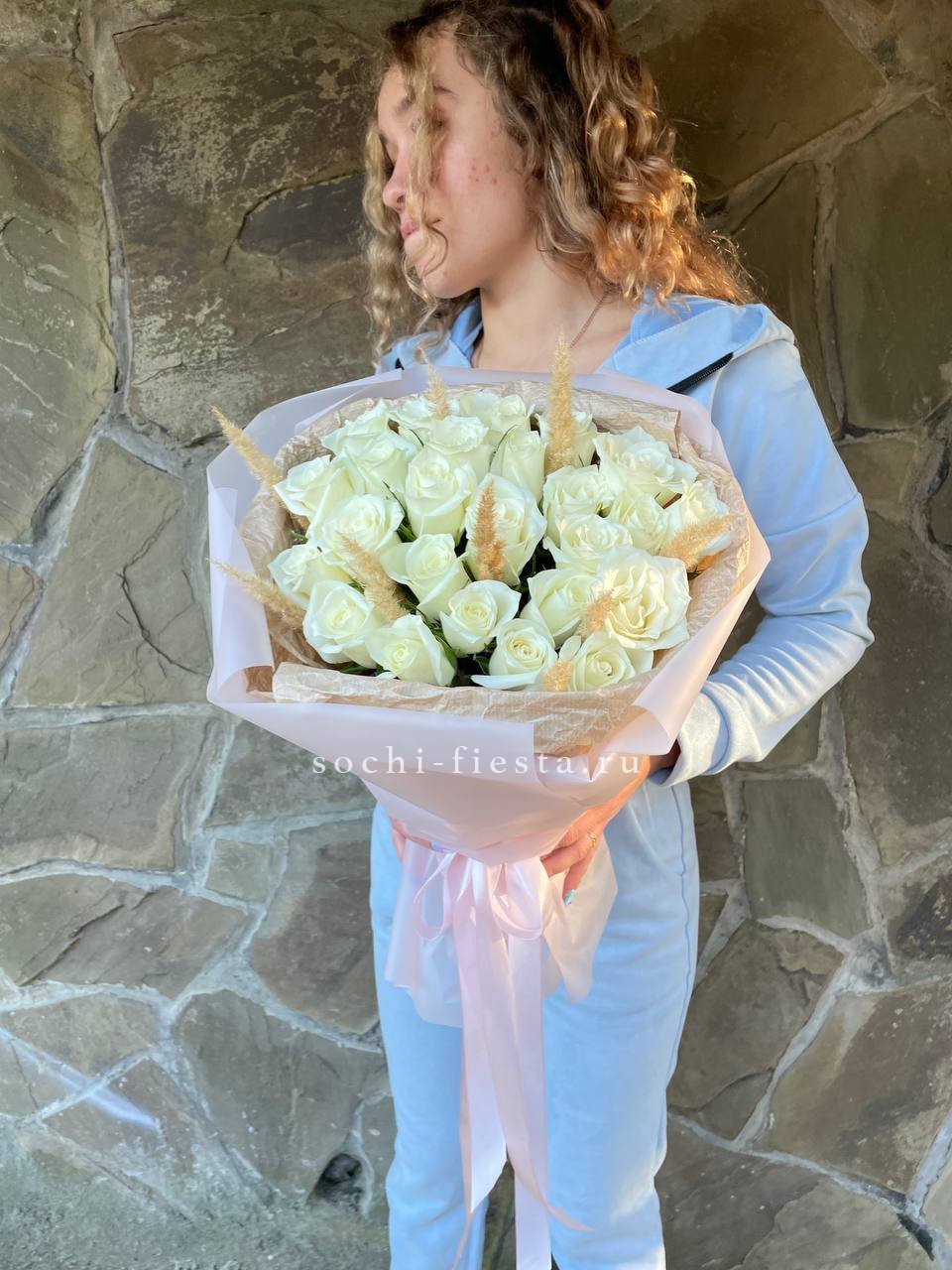 Пятнадцать белых роз в тонкой дизайнерской упаковке создают ощущение лёгкости и чистоты. Матовая текстура бумаги и мягкие складки подчёркивают форму каждого бутона. Композиция выглядит свежо и современно.