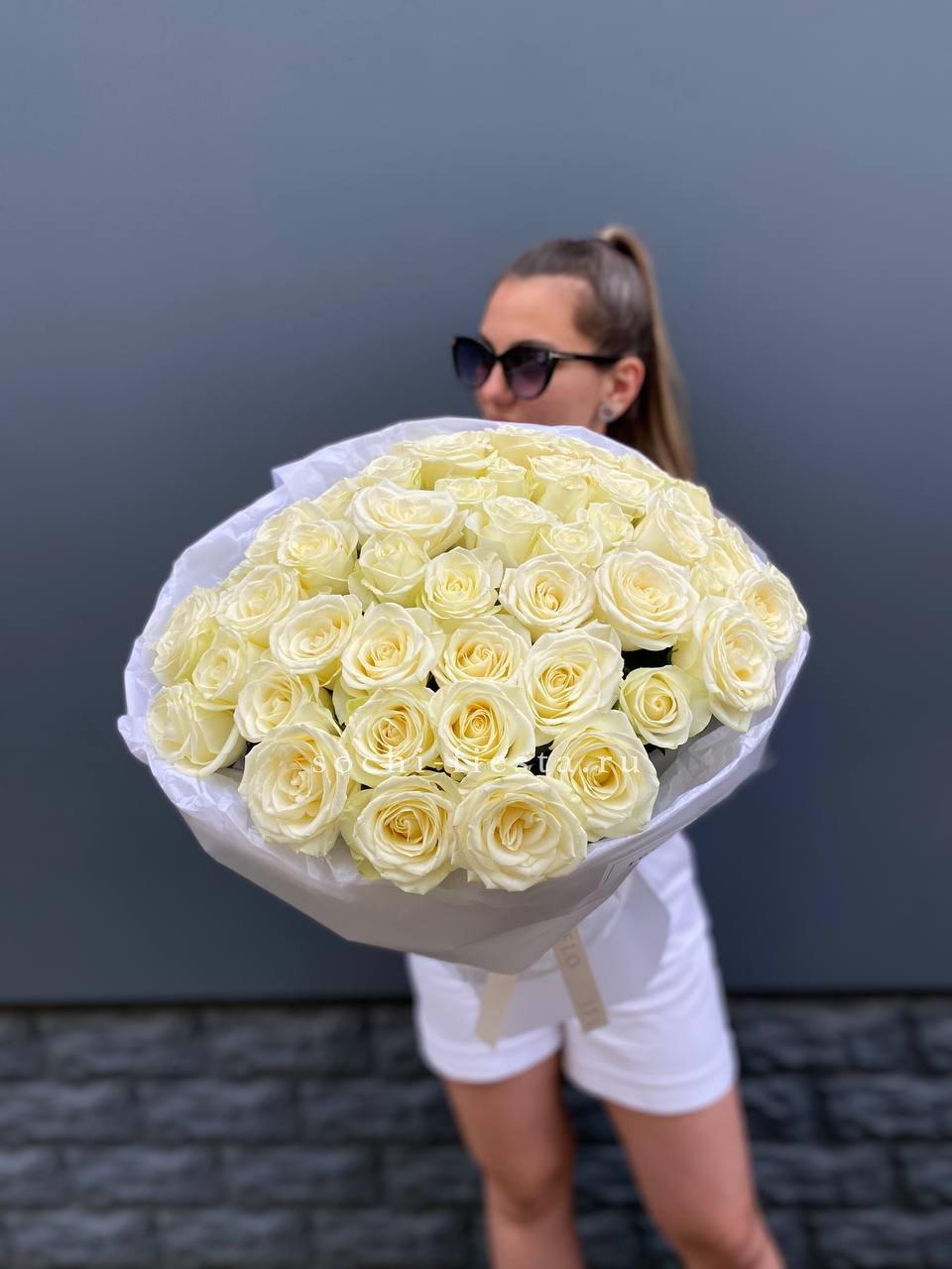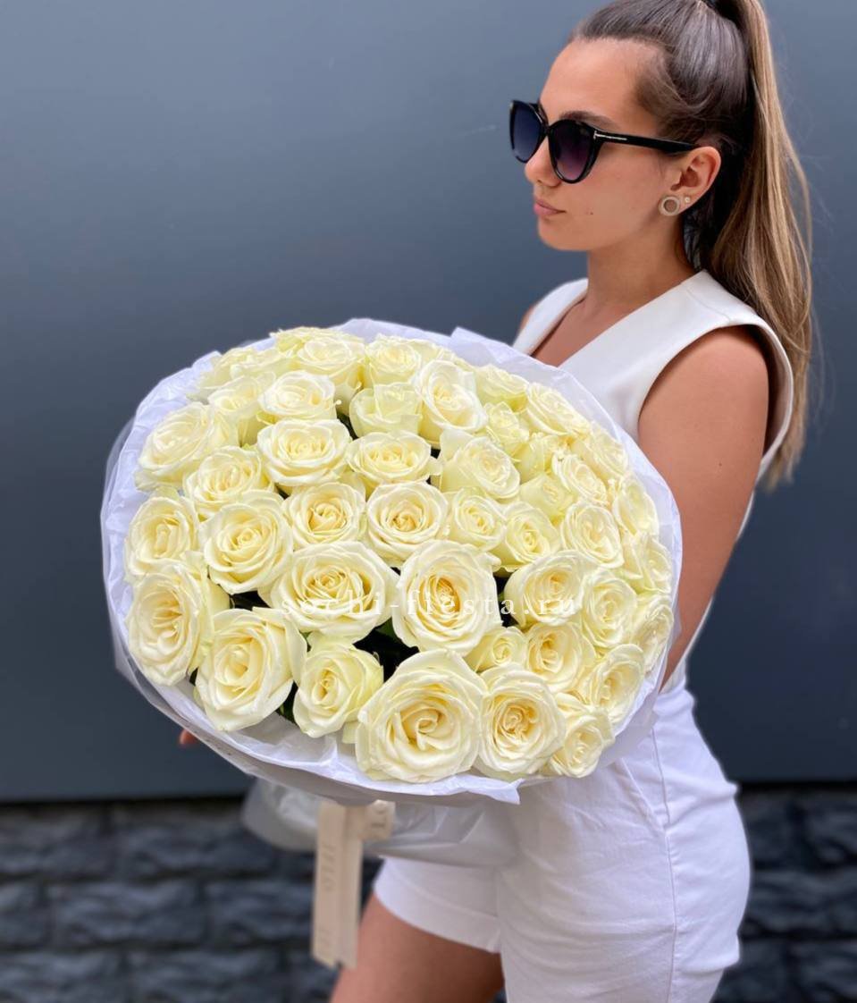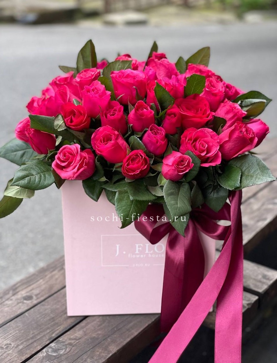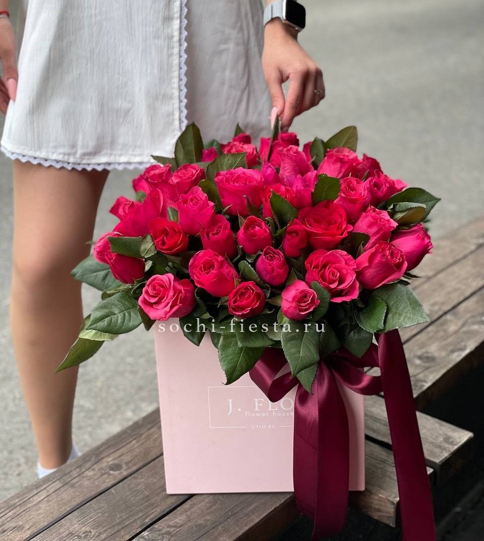 Одиннадцать роз сорта Naomi радуют глубоким красным оттенком и бархатистой поверхностью лепестков. Композиция выглядит свежо и уверенно в любом интерьере.
