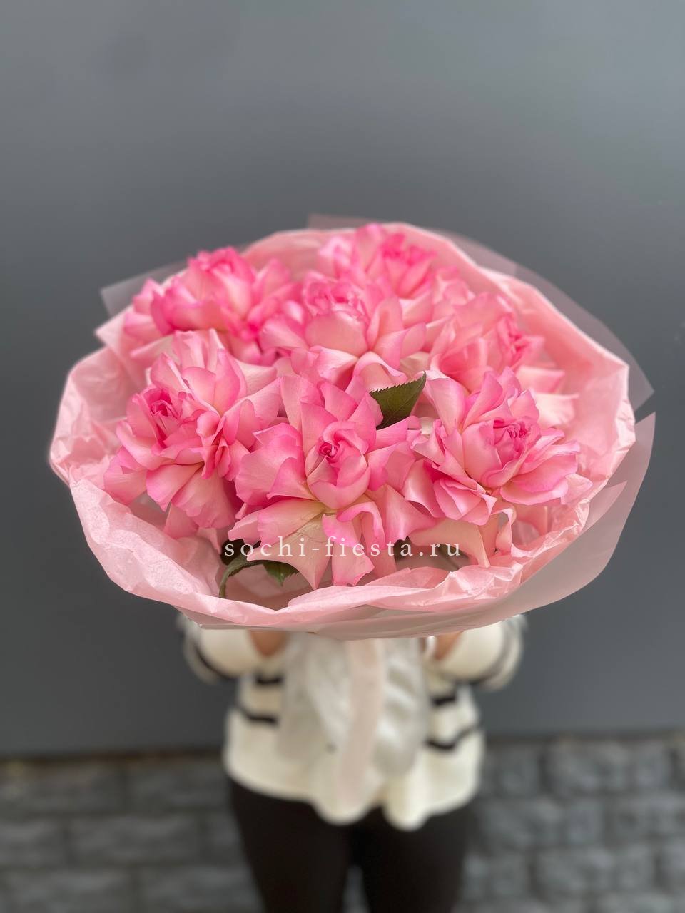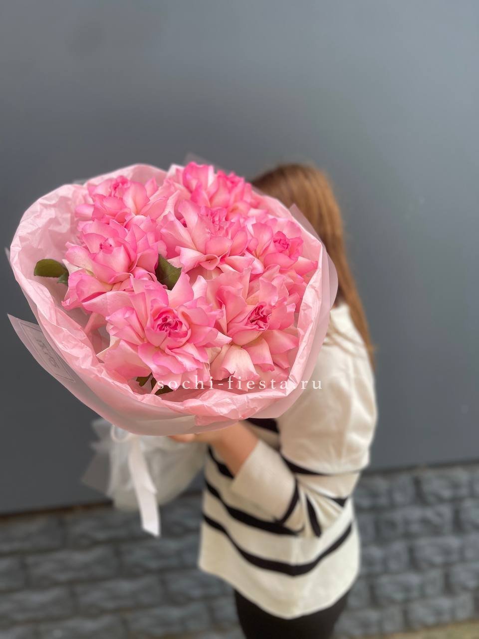 Девятнадцать бутонов раскрываются плавными волнами, создавая объёмную композицию с чёткими линиями. Розовый оттенок переходит от светлого к насыщенному, а эвкалипт добавляет воздушности между соцветиями. Букет держит форму и выглядит самодостаточно.