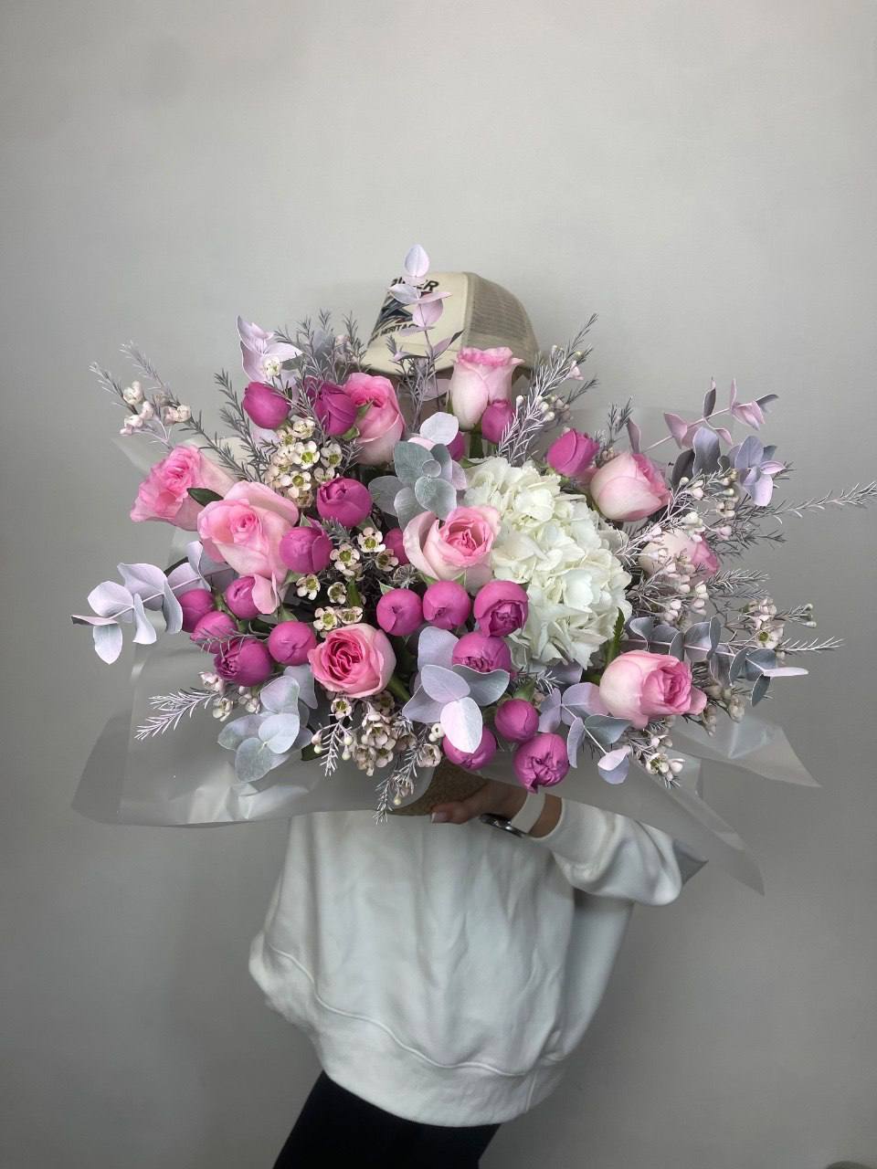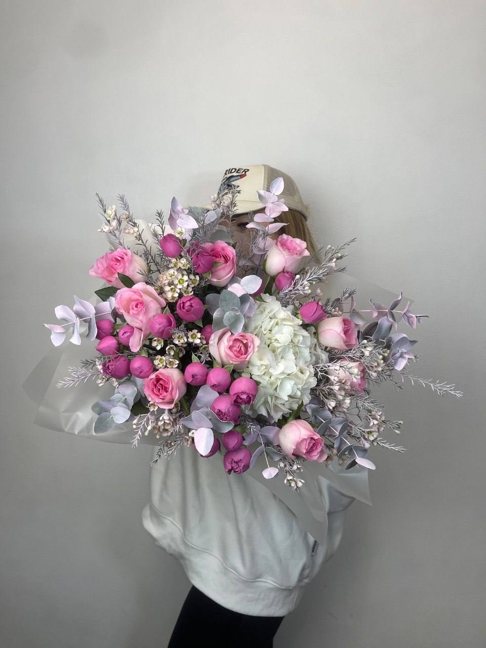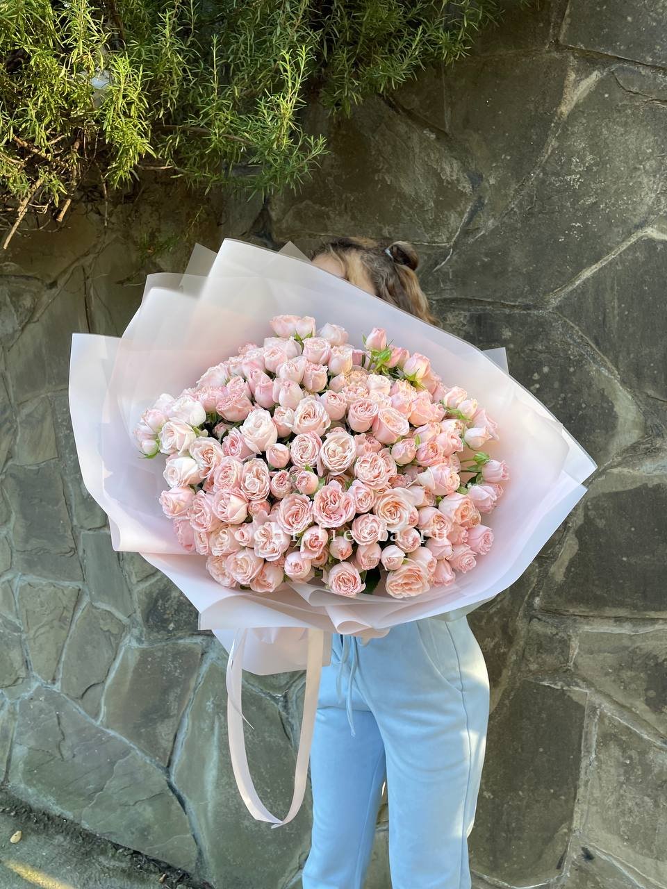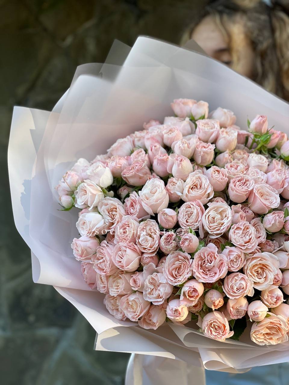 Сорок пять пионовидных роз Бомбастик в пастельной гамме образуют воздушное облако из многослойных бутонов. Композиция впечатляет объемом и создает ощущение легкости благодаря нежным переливам кремовых и персиковых тонов.