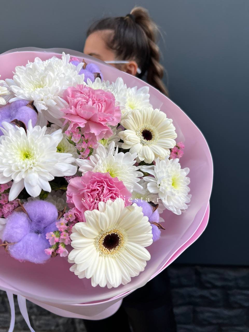 Хлопковые коробочки разбивают ритм ярких гербер и создают паузы между цветовыми пятнами. Статица заполняет пространство лёгкой дымкой, а диантусы добавляют рельеф по краям.