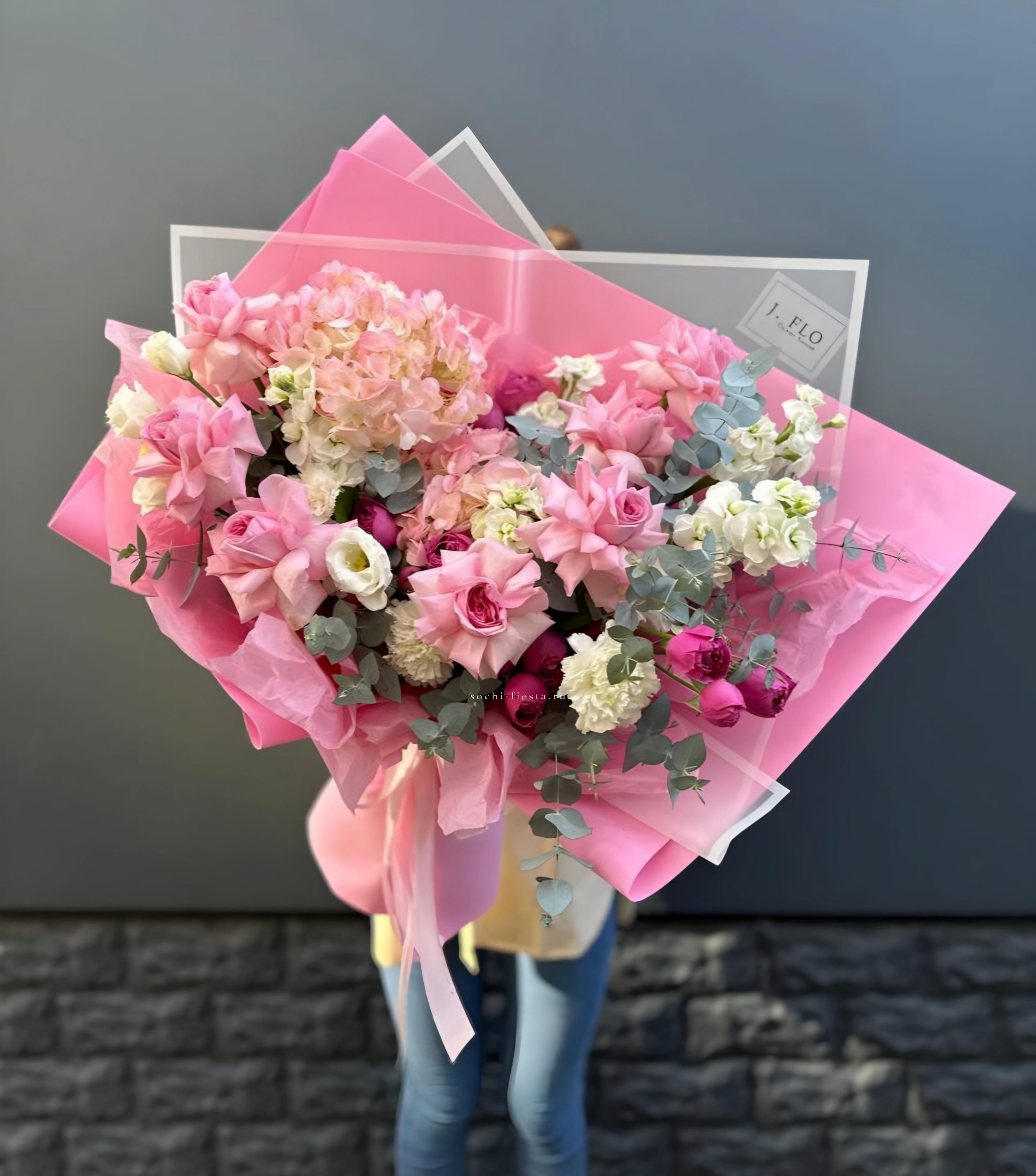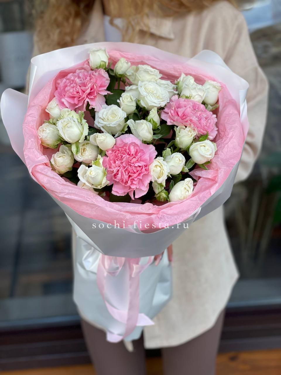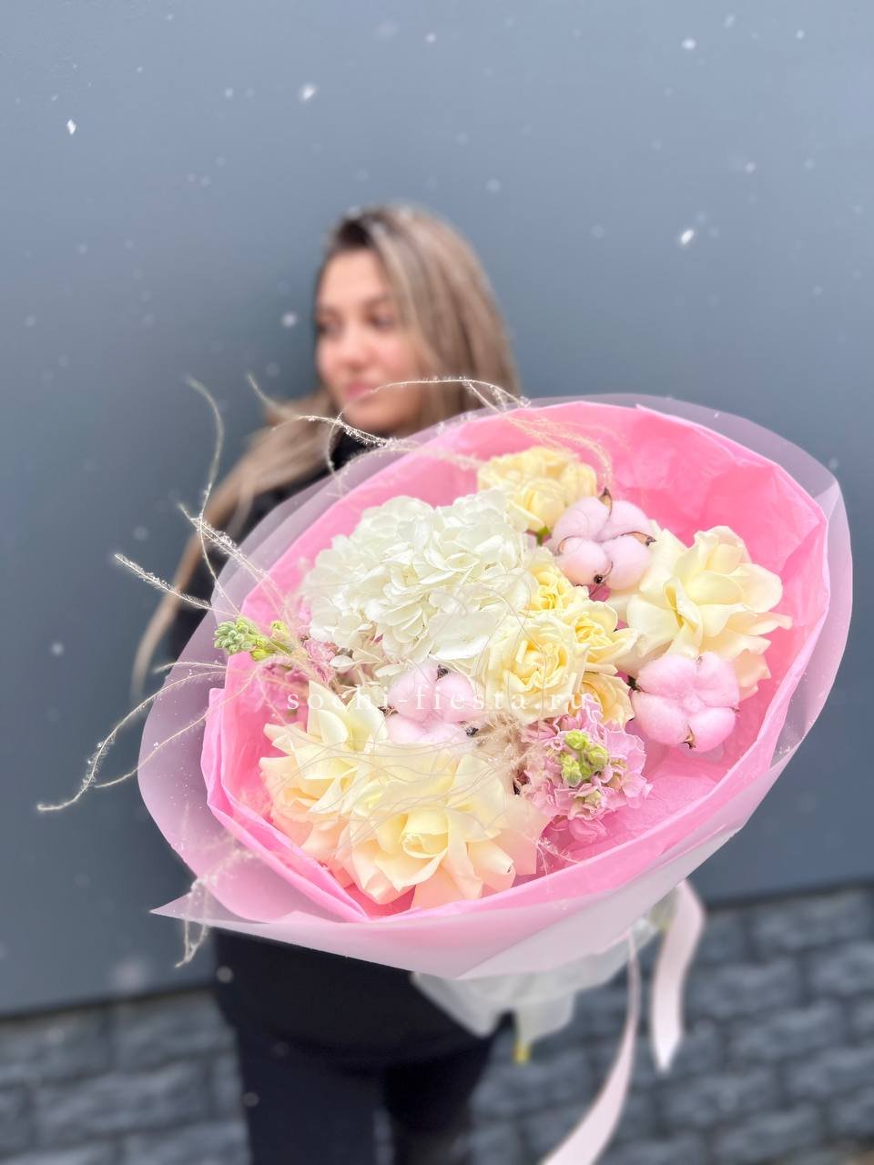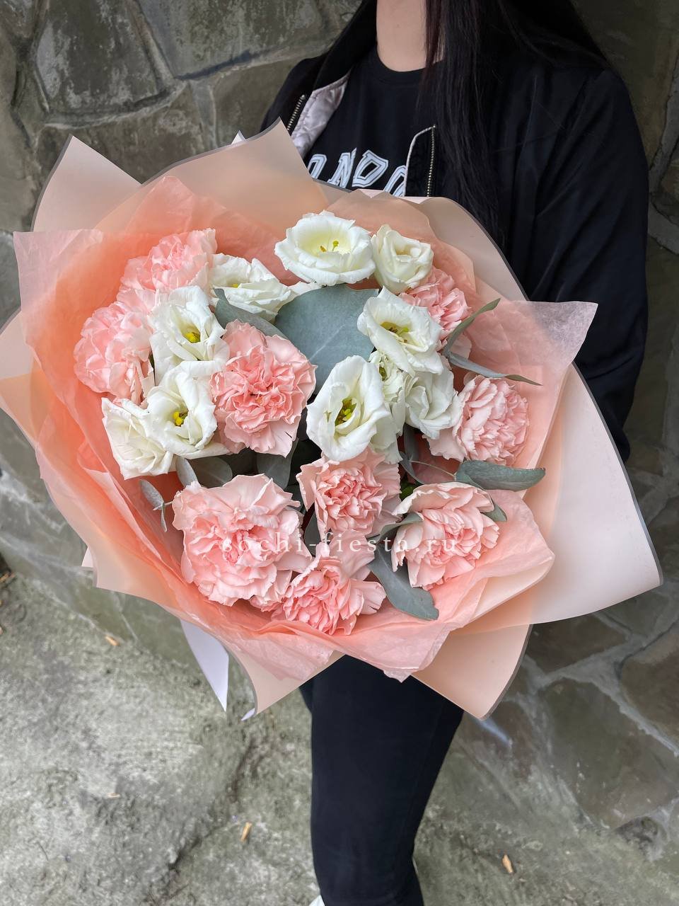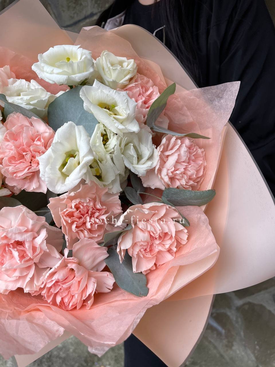 Кустовые розы и эустомы собраны в компактную форму с мягкими линиями. Сочетание нескольких оттенков создаёт живописный эффект без лишней пышности.
