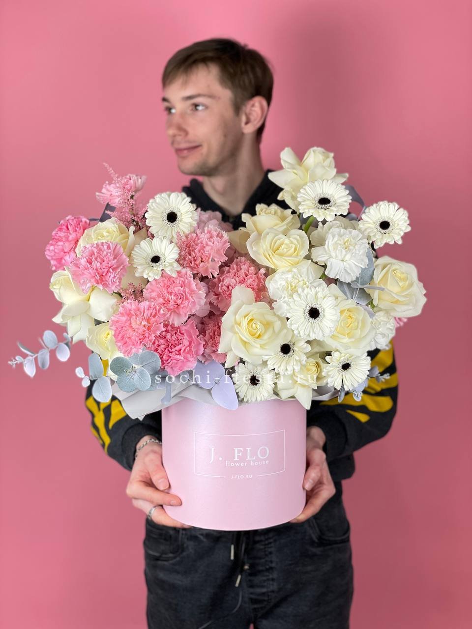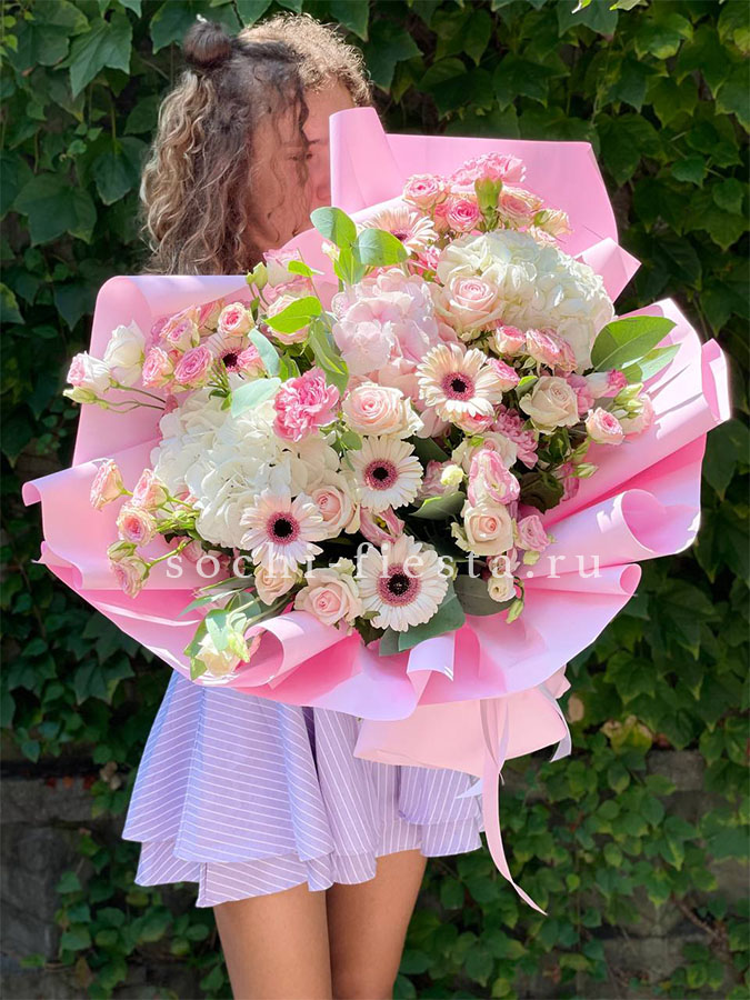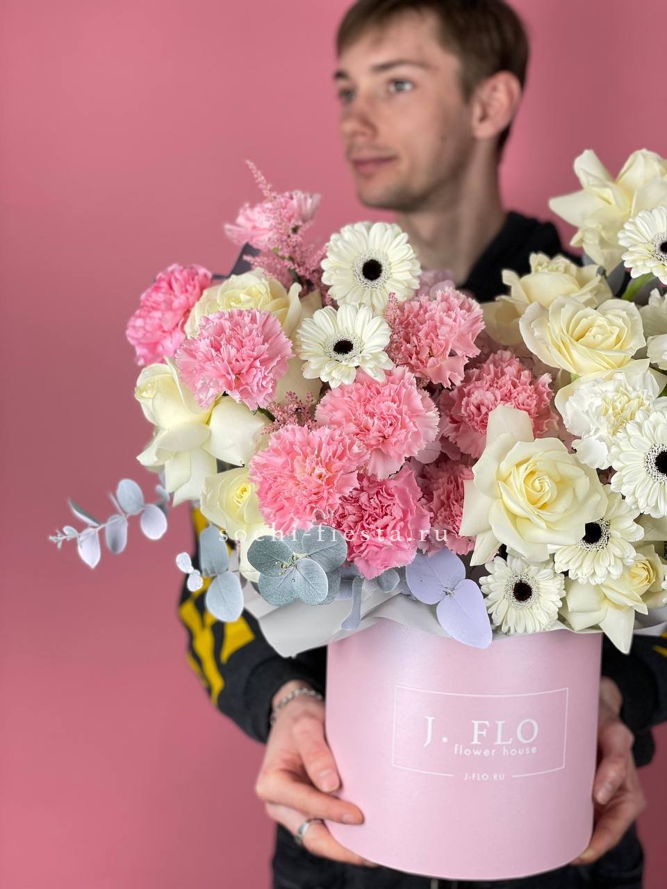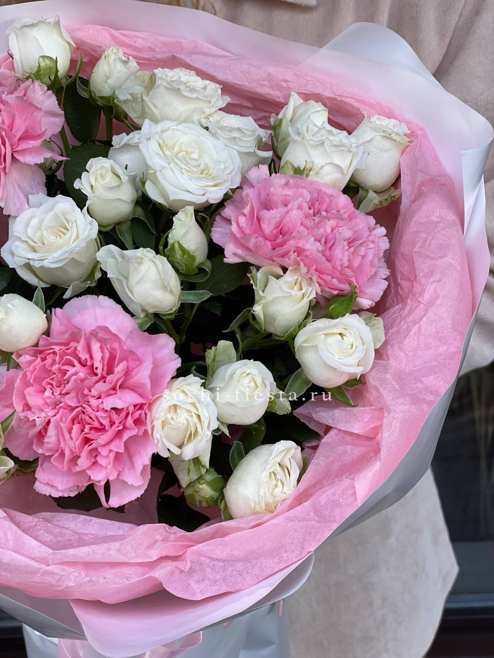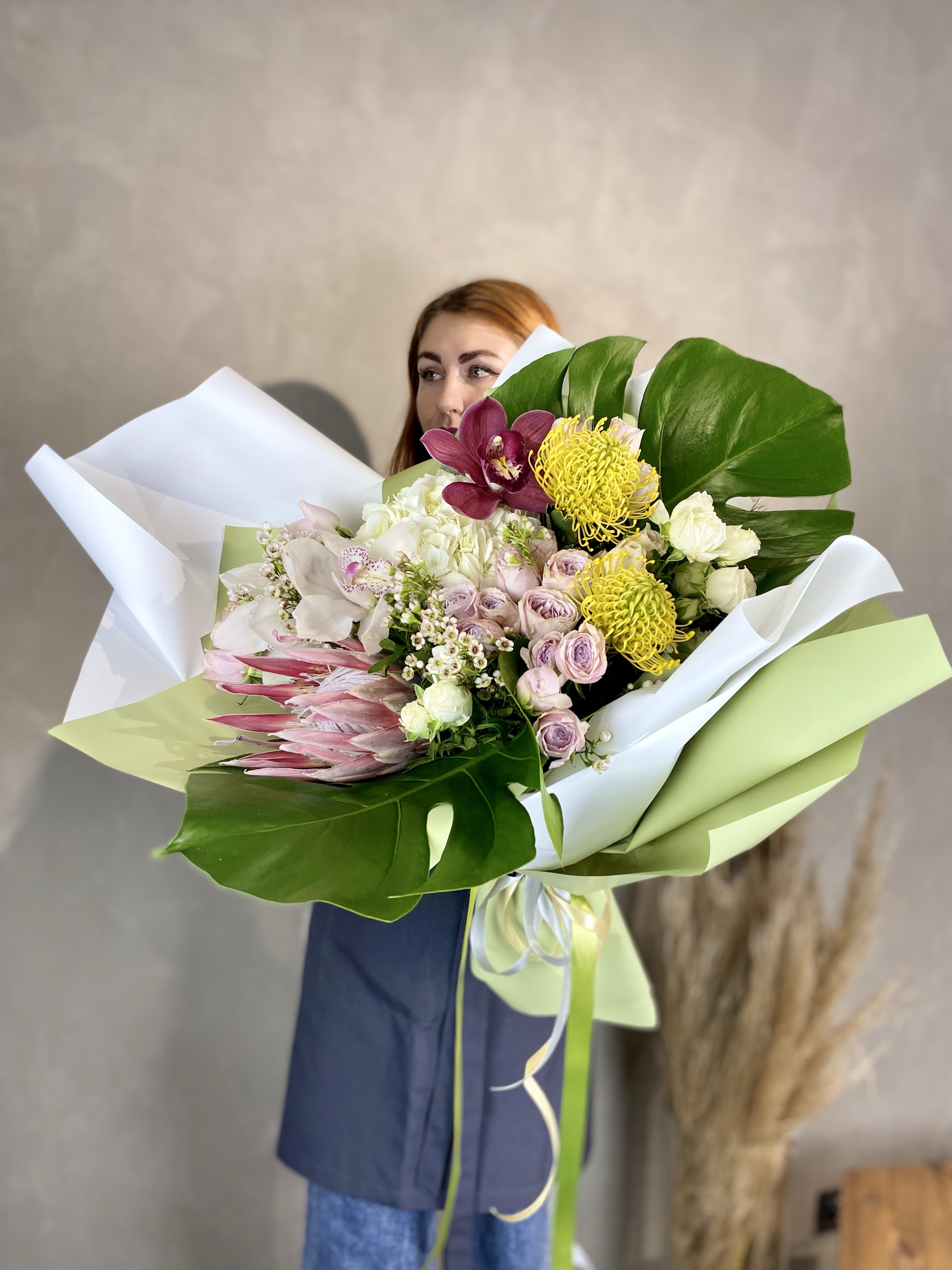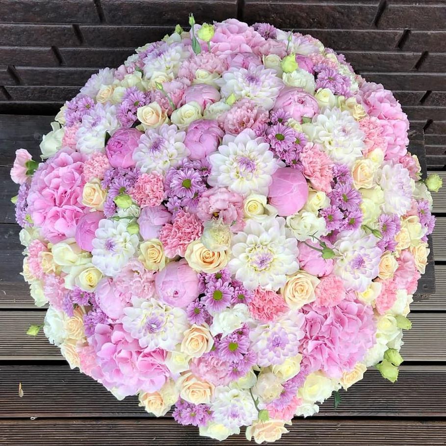 Кустовые розы и эустомы собраны в компактную форму с мягкими линиями. Сочетание нескольких оттенков создаёт живописный эффект без лишней пышности.