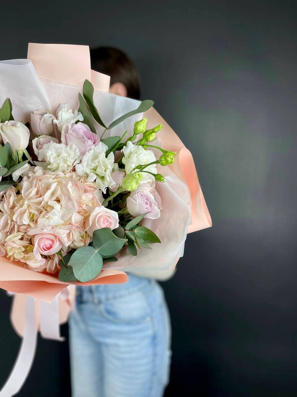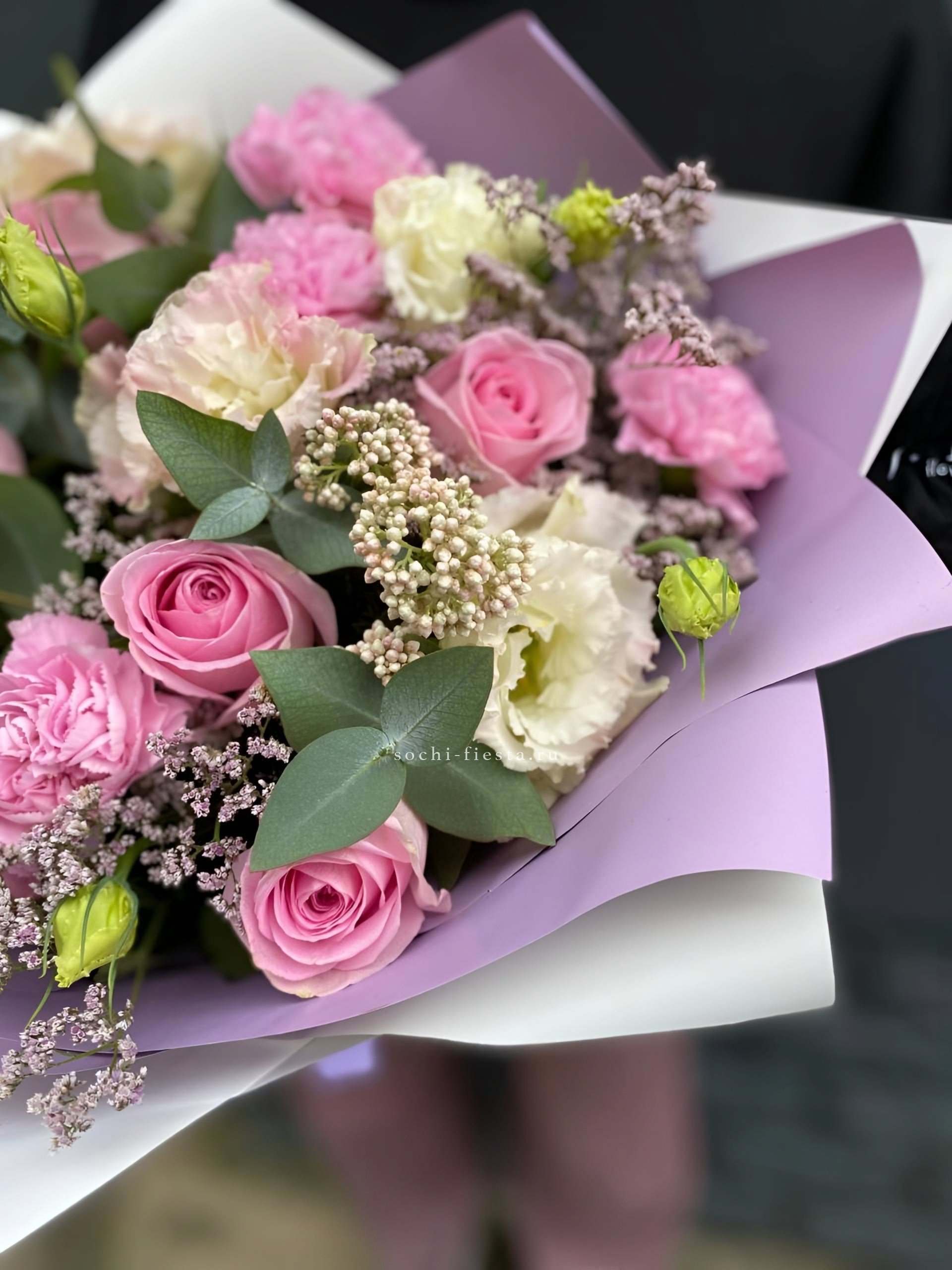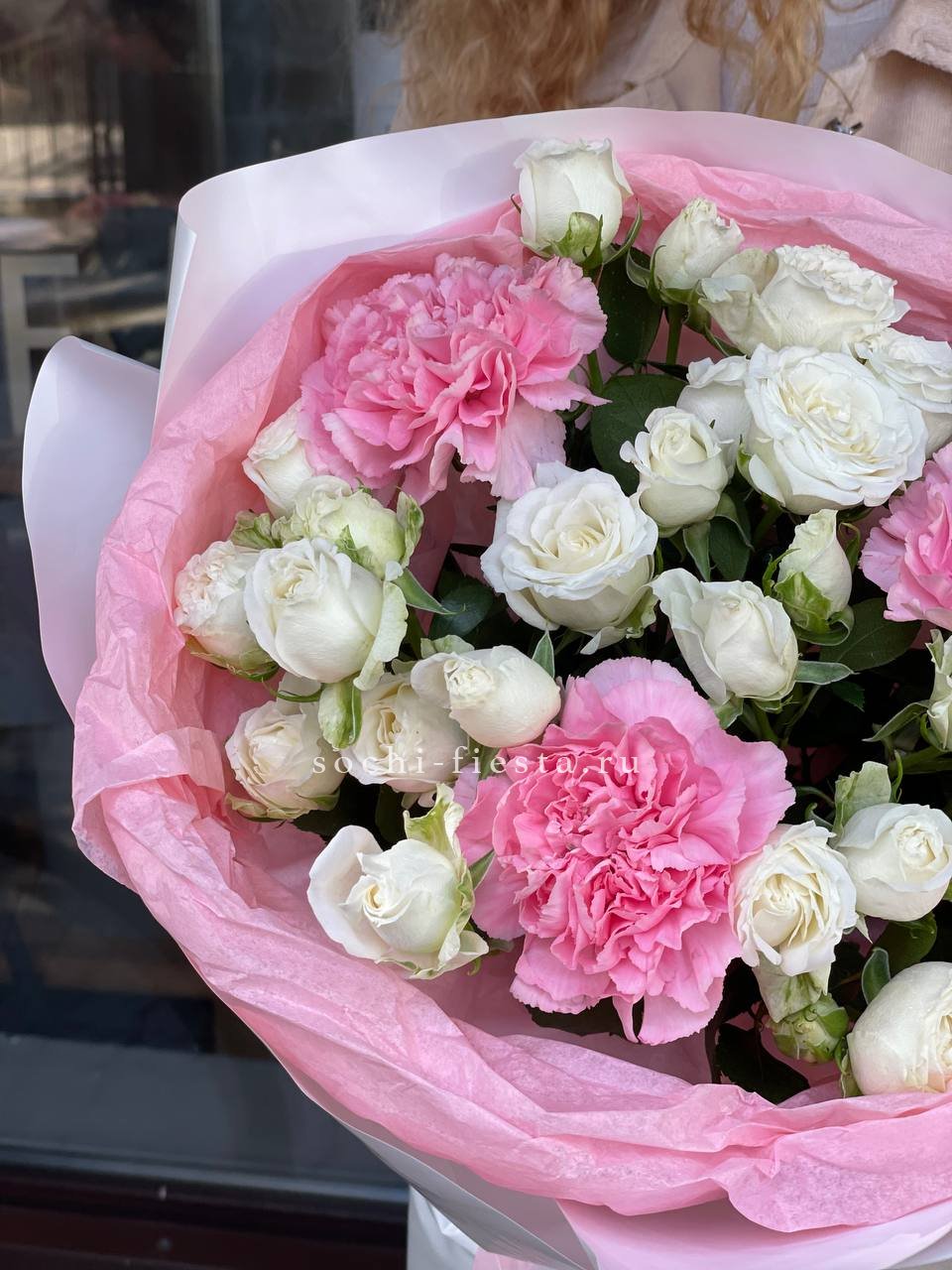 Плотные головки диантусов рассыпаны между кустовыми розами, создавая живую текстуру. Компактная форма букета удобна для небольших пространств и долго сохраняет свежесть.