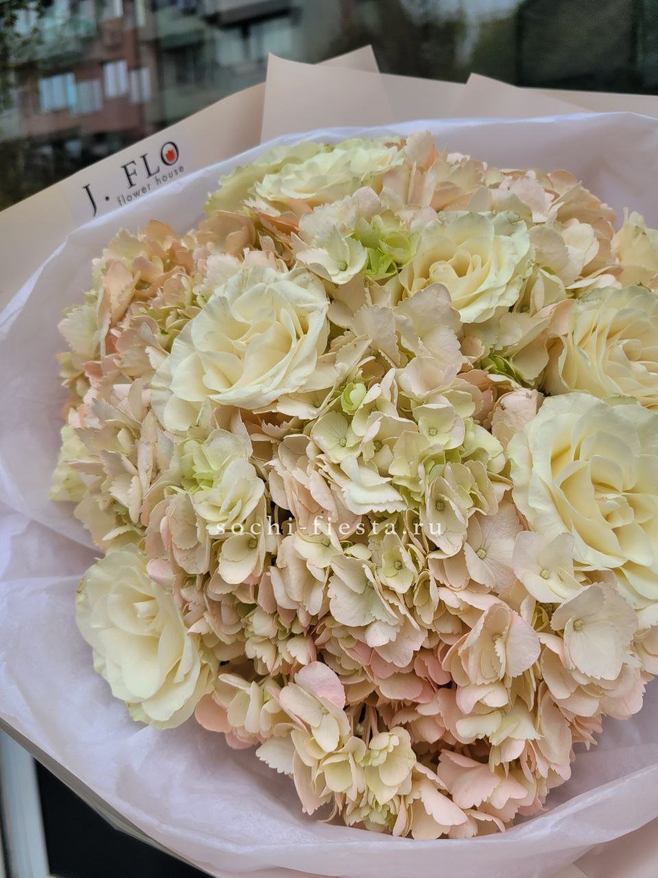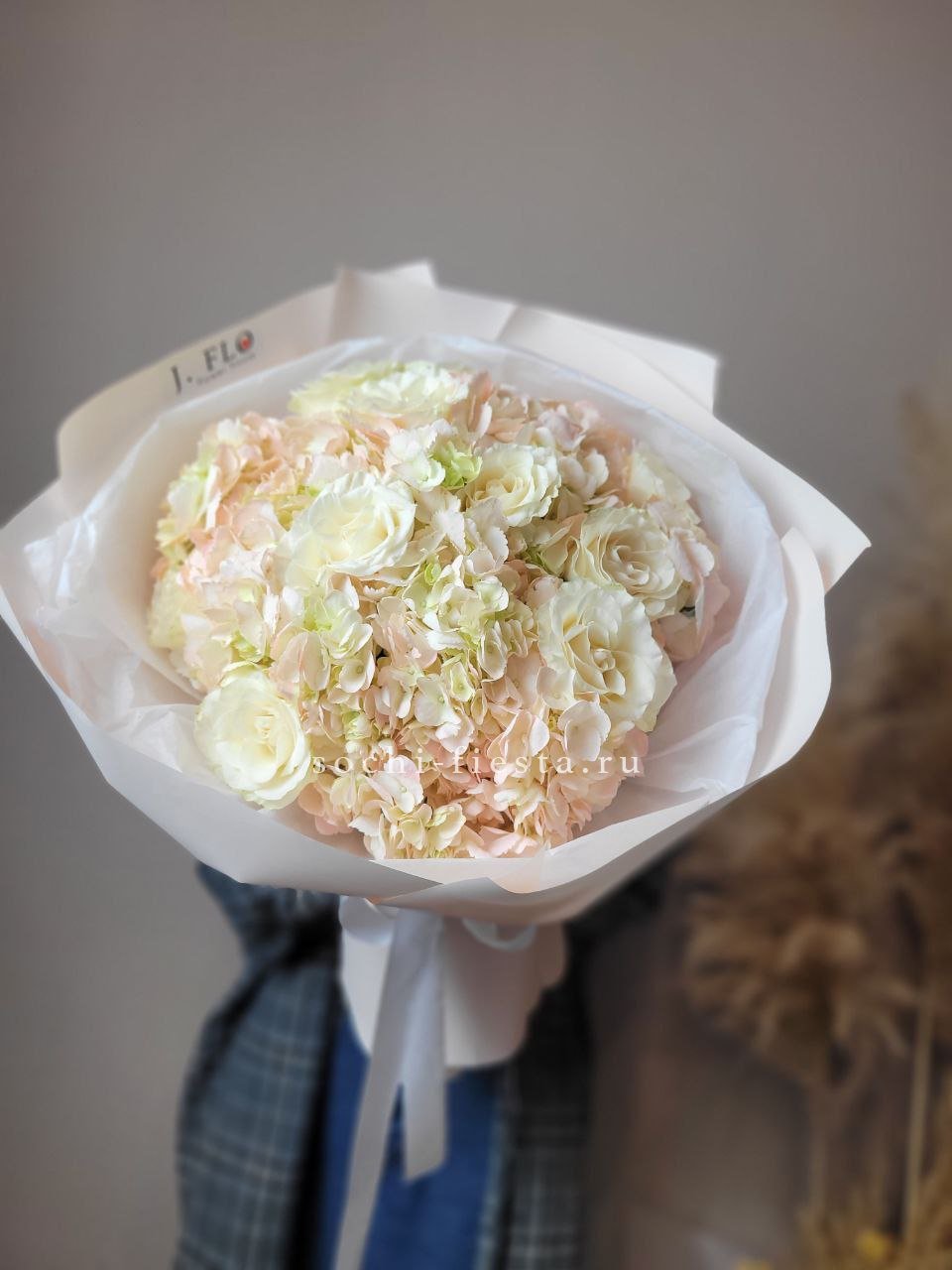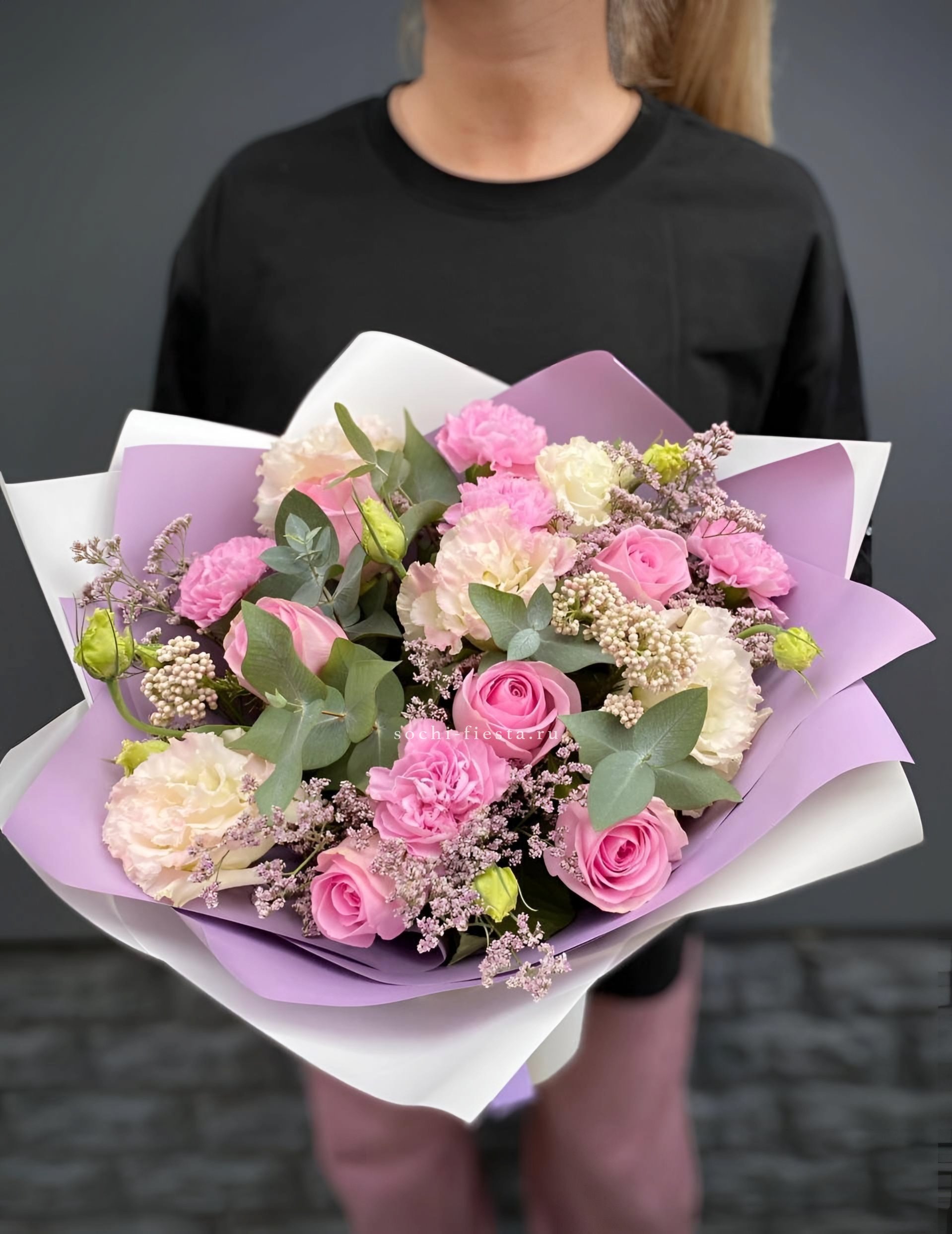 Плотные головки диантусов рассыпаны между кустовыми розами, создавая живую текстуру. Компактная форма букета удобна для небольших пространств и долго сохраняет свежесть.