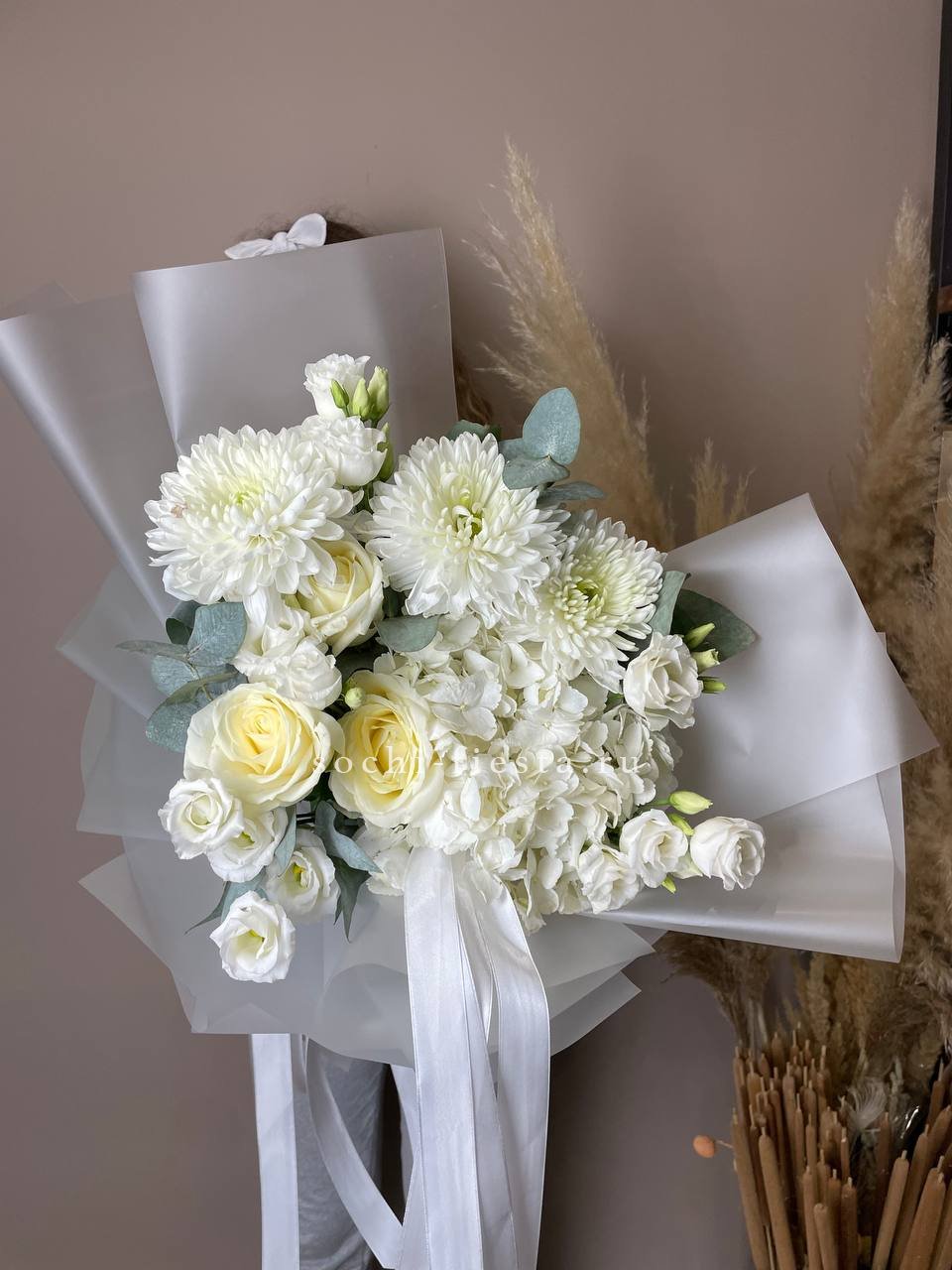 розовая гортензия, белые ирисы (или эустома), лента, дизайнерская упаковка.
