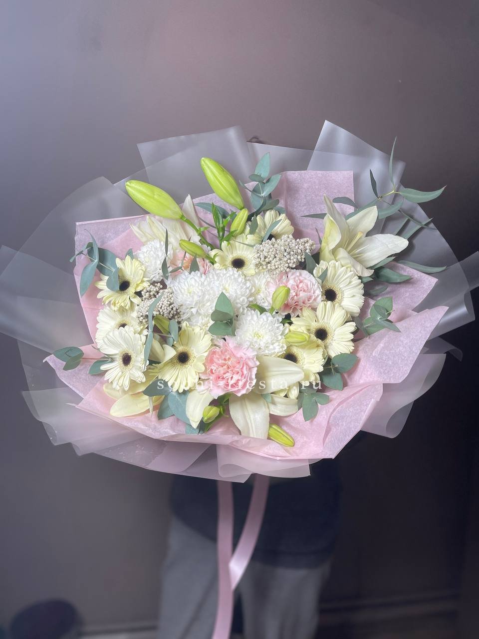 гербера, диантус, гортензия, бомбамстик, озатамус в нежном оформлении.