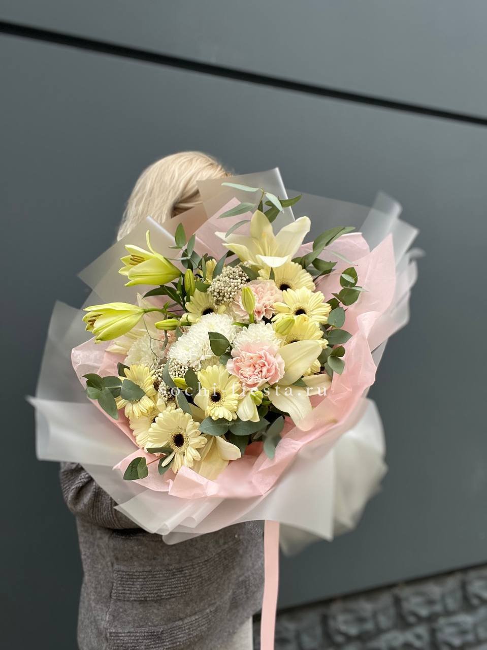 Герберы и гортензия создают воздушную композицию с лёгким ритмом и плавными переходами. Бомбамстик добавляет графики, а диантус смягчает общую форму.