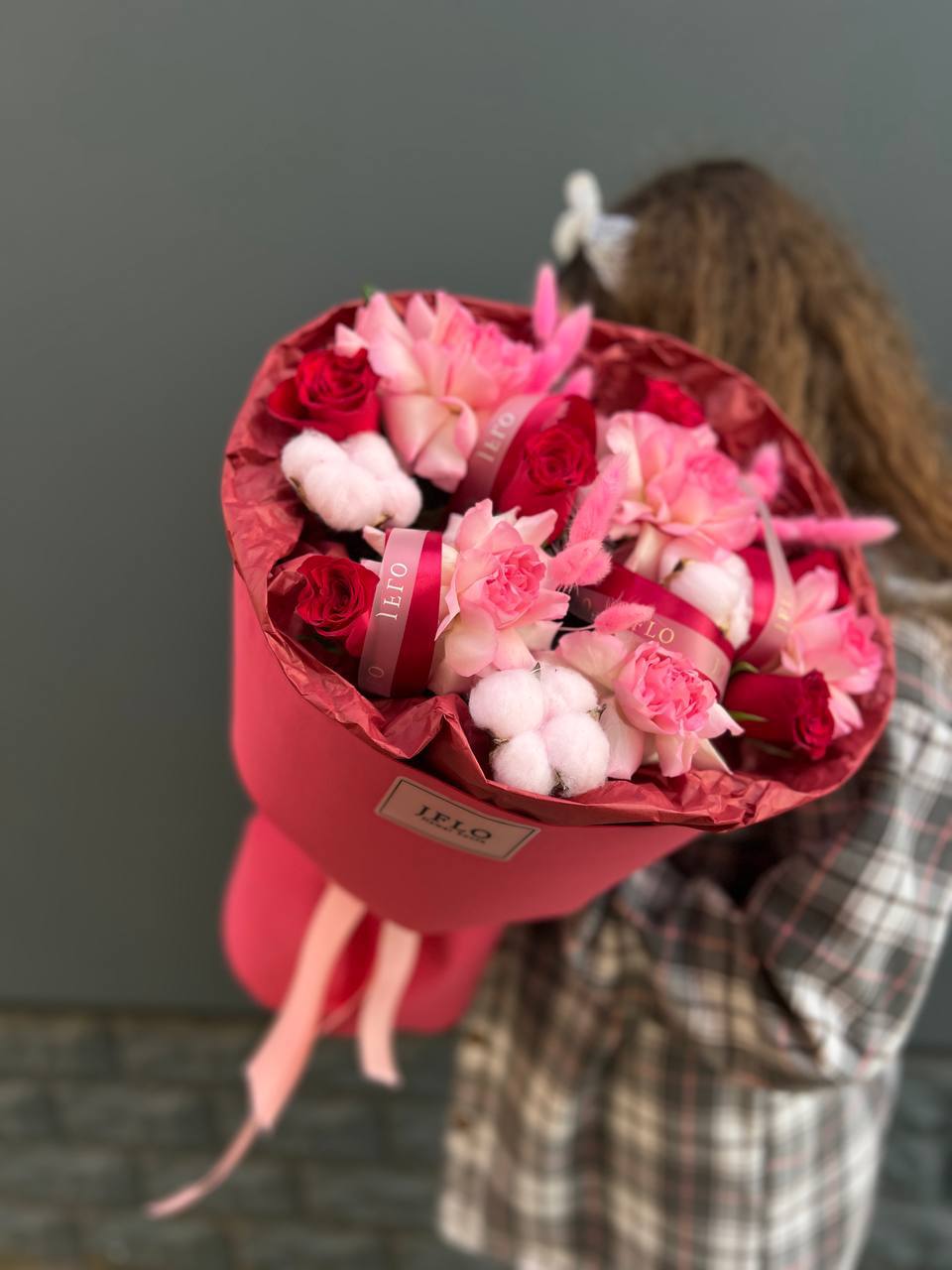 В центре внимания — фактуры и цвет! Современный, стильный букет, который сочетает бархатистые бутоны роз и мягкий хлопок. Это не просто цветы, а целая цветочная композиция для тех, кто ценит красоту в деталях. Отличный повод порадовать себя или близких!