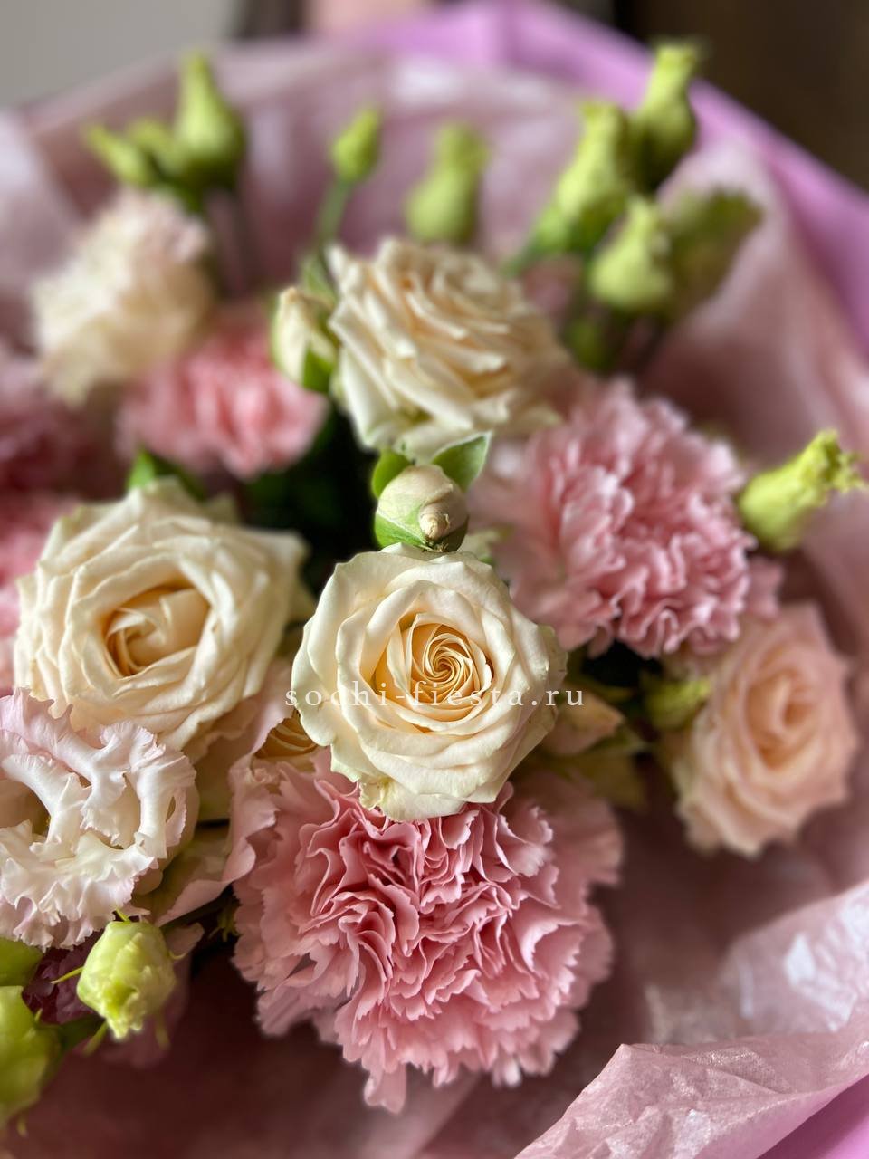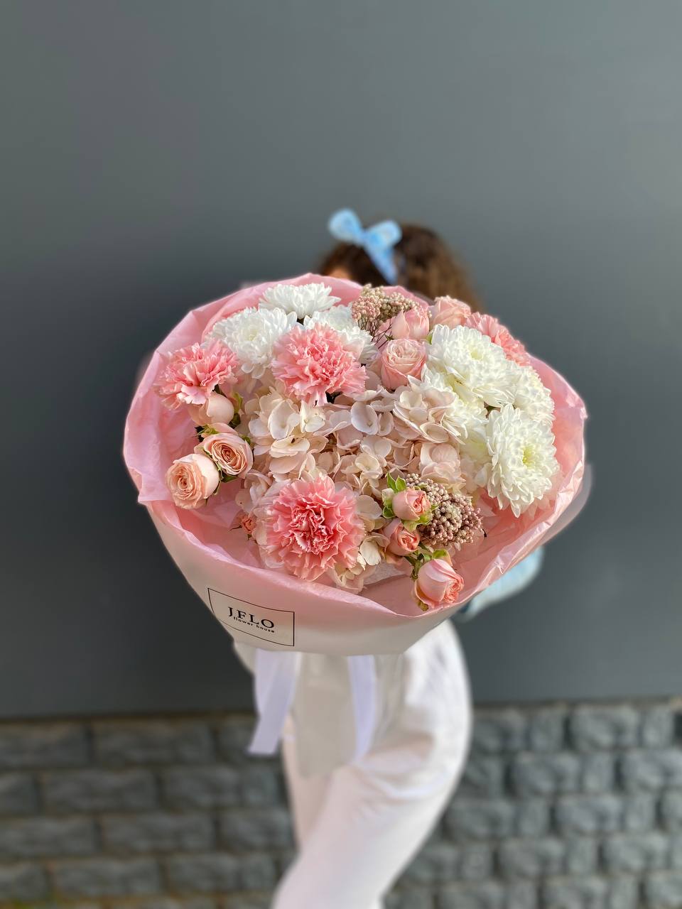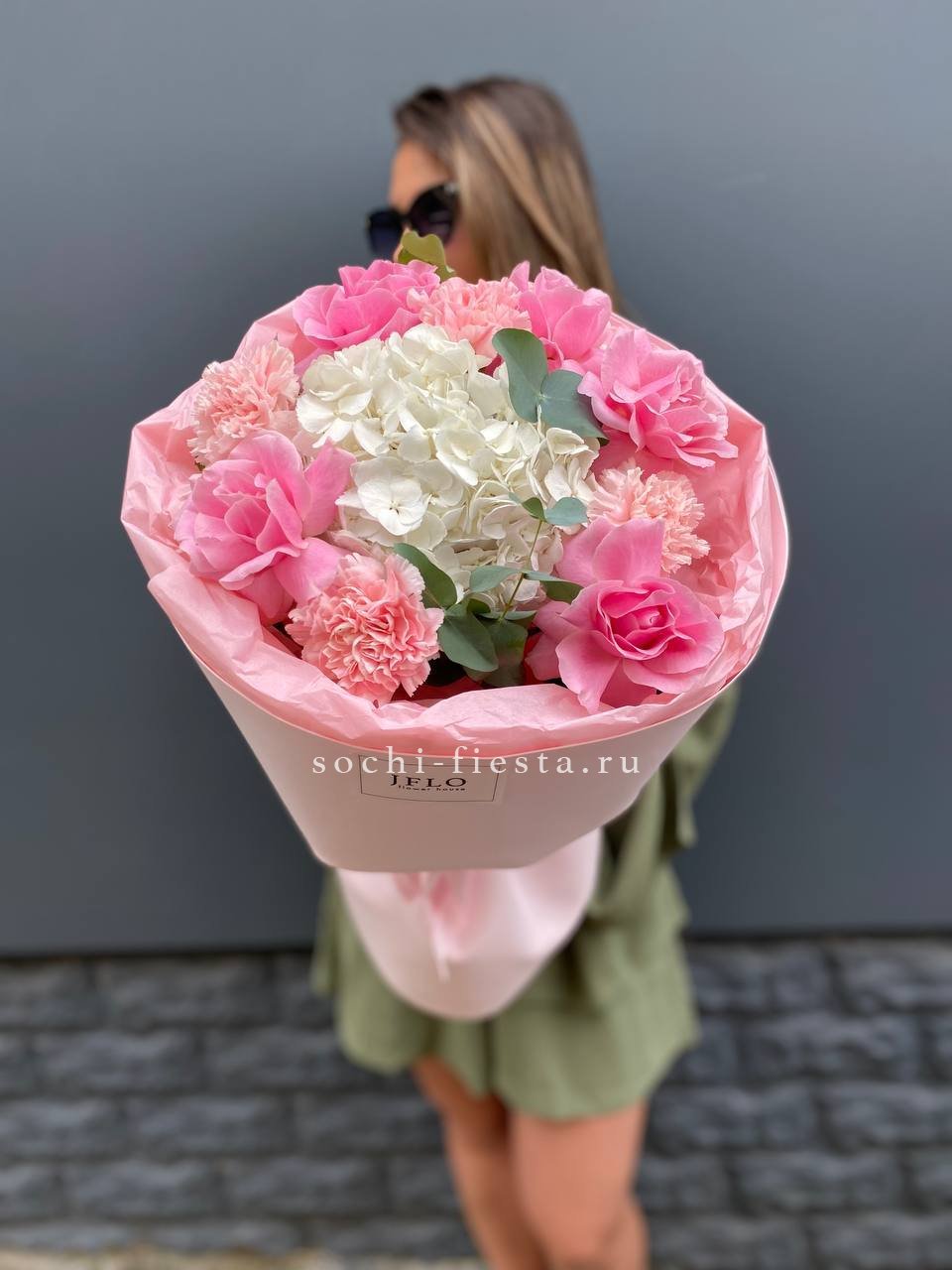 Пионовидные розы и гортензия образуют плотное ядро композиции, а диантус с эустомой разворачиваются по краям. Эвкалипт задает движение и глубину всей формы.