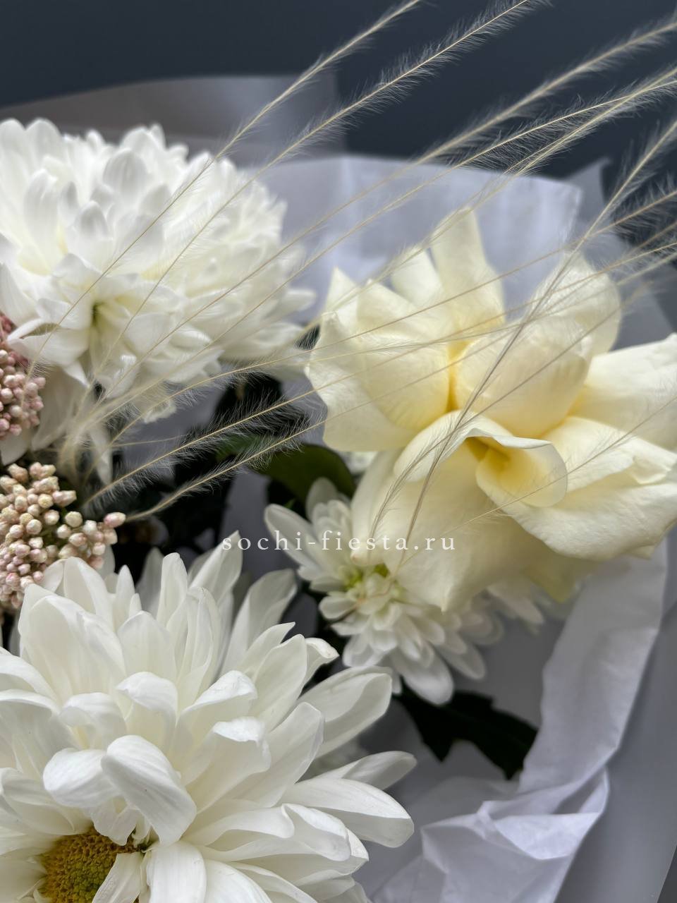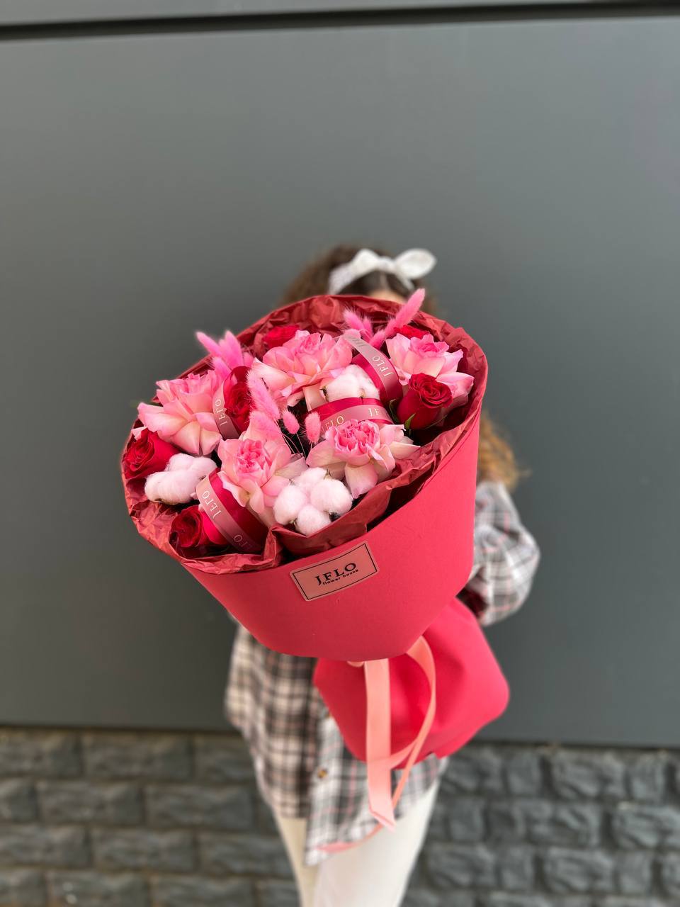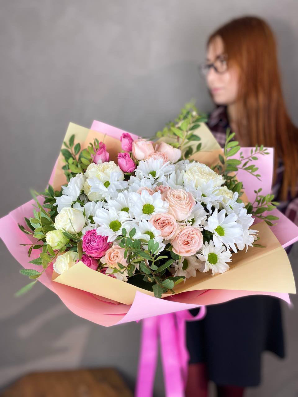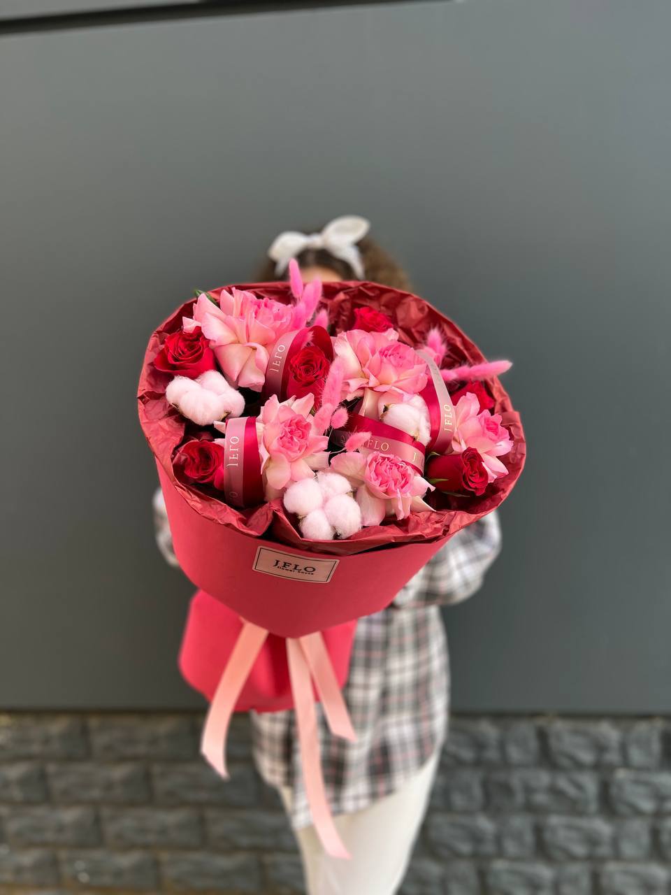 Пионовидные розы и гортензия образуют плотное ядро композиции, а диантус с эустомой разворачиваются по краям. Эвкалипт задает движение и глубину всей формы.