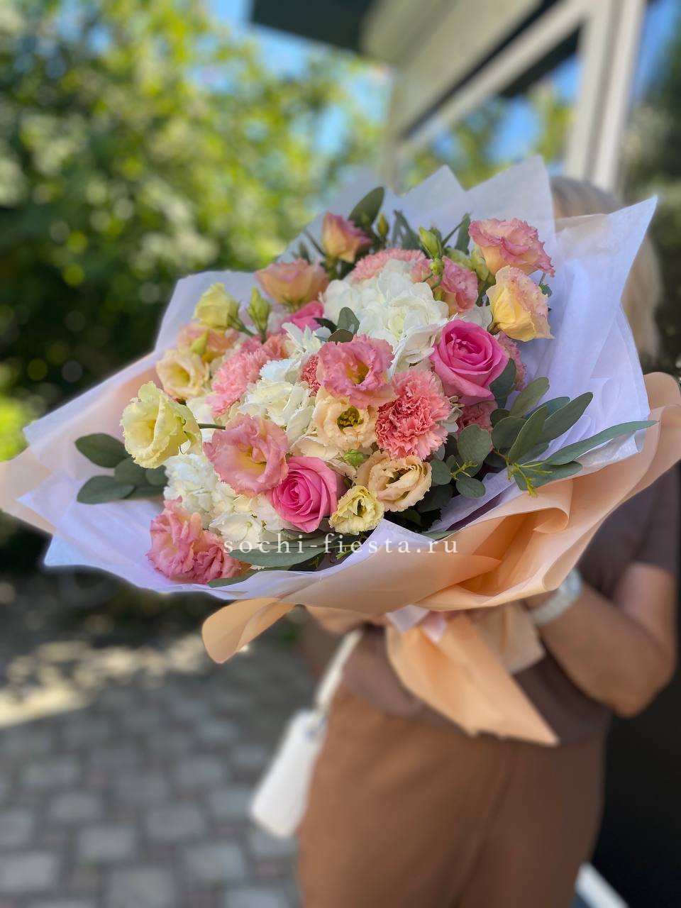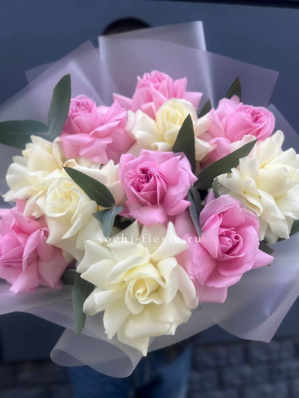Кустовая хризантема и маттиола образуют гармоничную пару с разной фактурой бутонов. Эвкалипт добавляет свежести и завершает композицию естественными линиями.