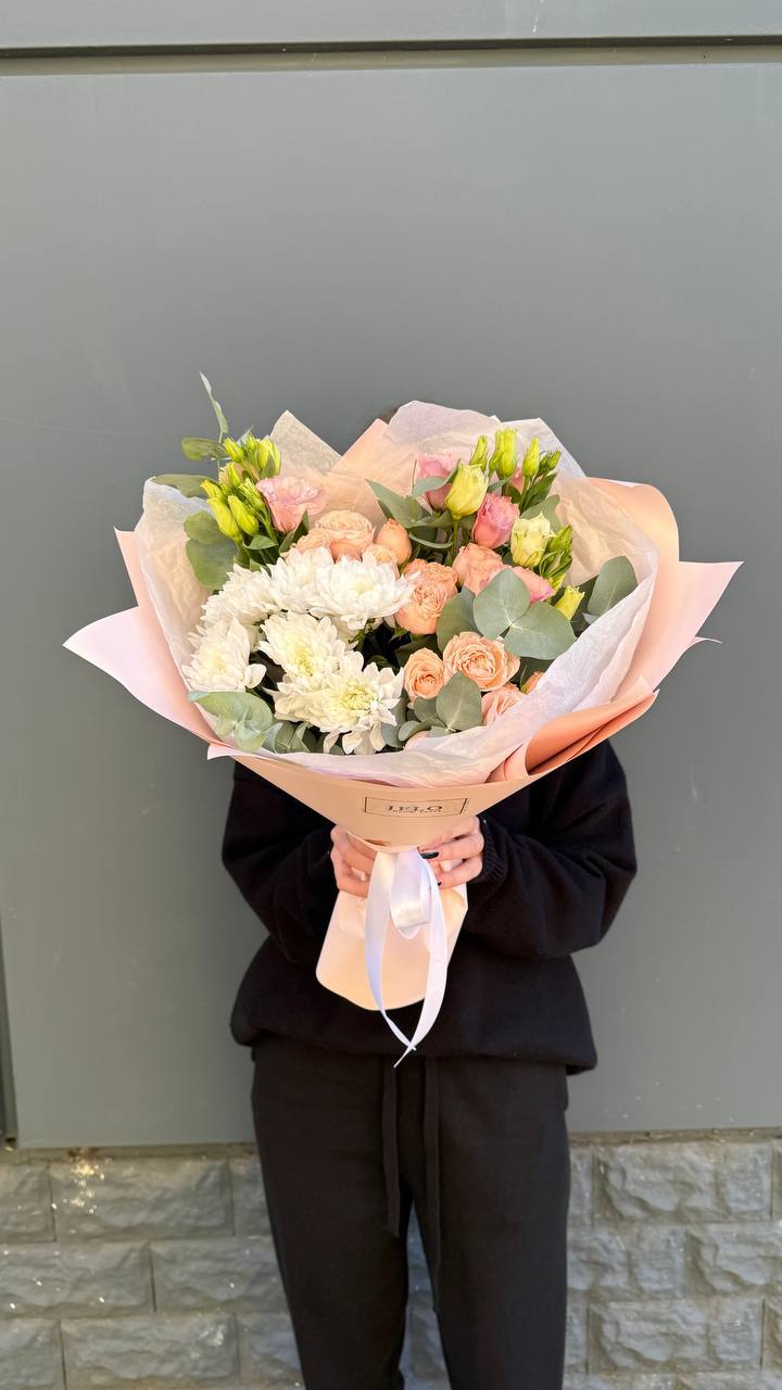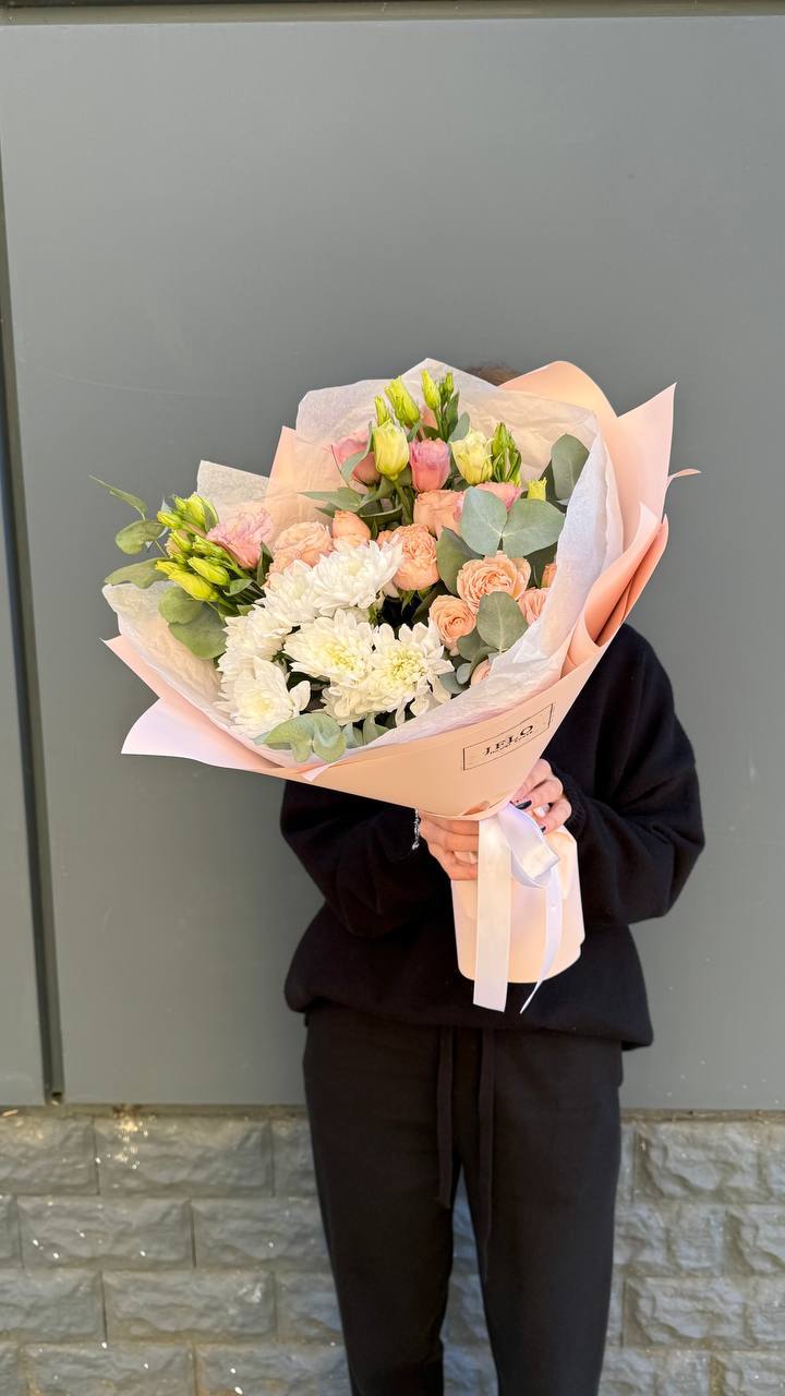 гортензия, пионовидные розы, пампасная трава (стифа), лента, дизайнерская упаковка.