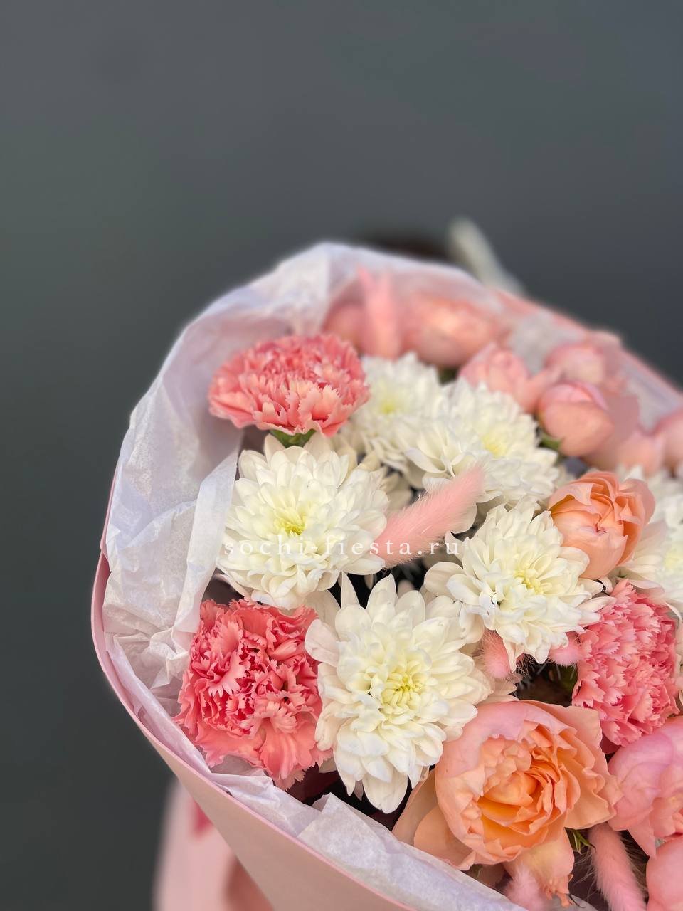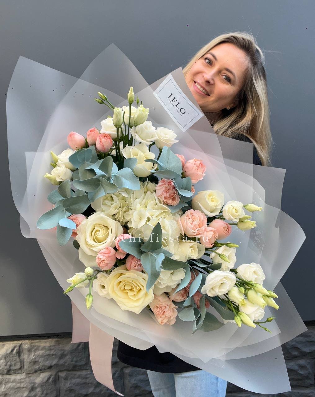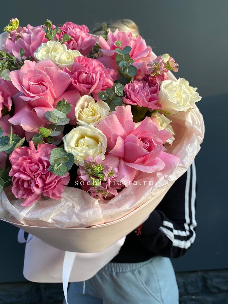 Букет держит форму за счёт зелени, которая создаёт лёгкий каркас вокруг цветов. Эвкалипт добавляет матовые оттенки, маттиола вносит текстурные всплески между бутонами роз.