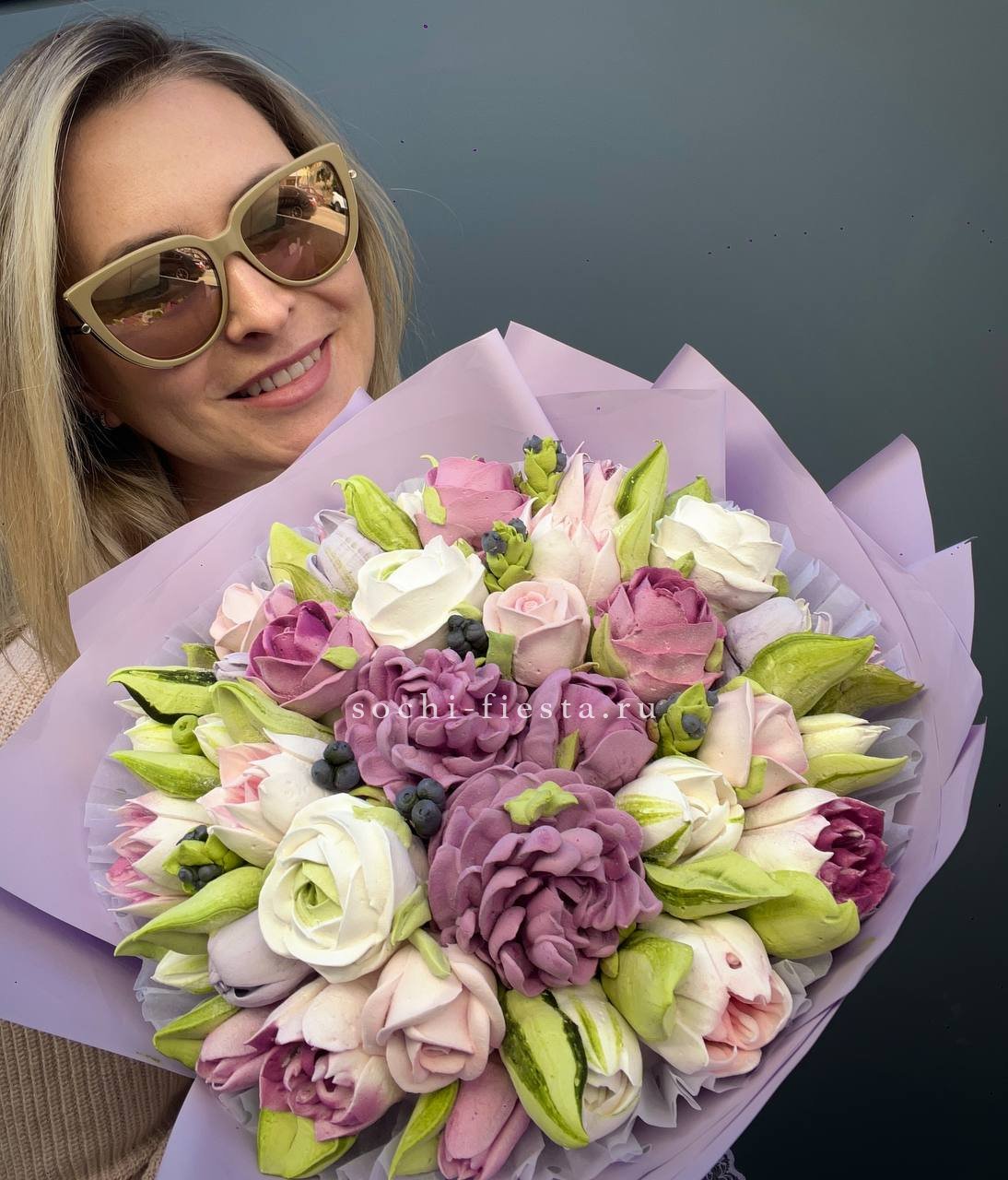 зефир в форме букета цветов. Состав: сахар, патока, пектин, агар, яблочное пюре, яичный белок, натуральный краситель, лимонная кислота. Цена за 1букет, размер М.